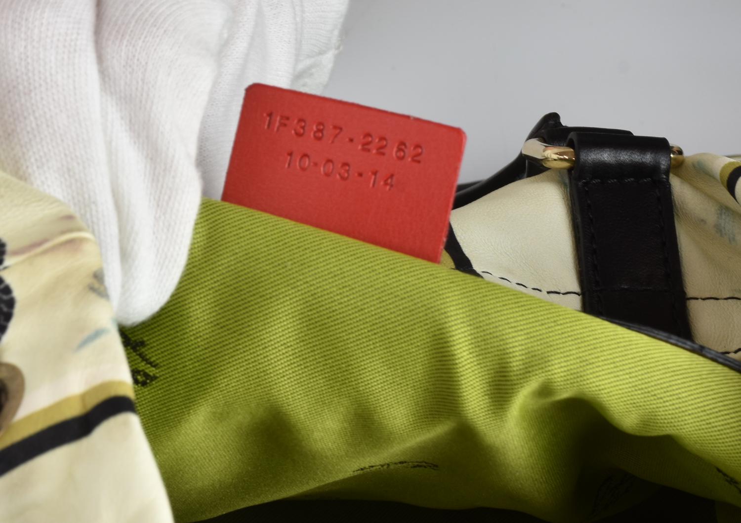 Printed leather tote bag with double handles. Closure with drawstring. Interior lined, organized in a single compartment with three side pockets—two flat and one with a zipper. Chrome metal hardware. Dimensions: 38.0x39.5x2.5 cm. Handle height: 55.0 cm. Product reference code: 1F387-2262 10-03-14. Made in Italy. Some stains, but overall in very good condition. Well preserved.