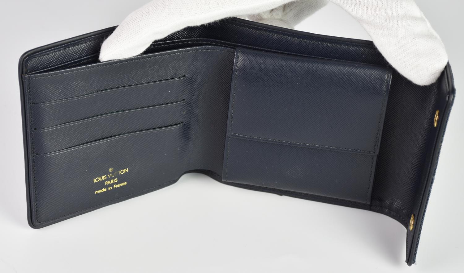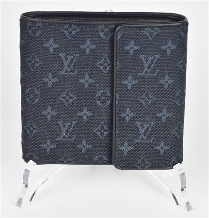 Portafoglio in canvas monogram blu, chiuso con due bottoni a pressione. Interno in pelle blu diviso in due scomparti, più una tasca separata per le monete con chiusura a pressione. Cm 11,50x10,50. Prodotto in Francia. Perfettamente conservato.