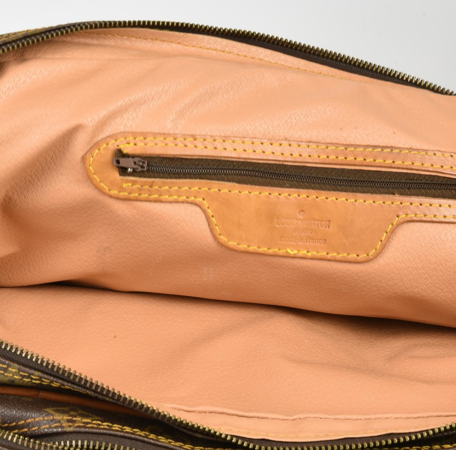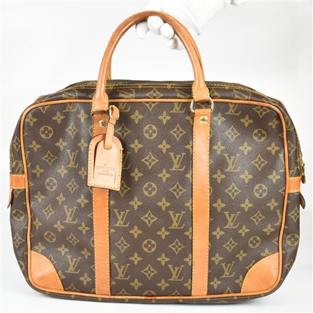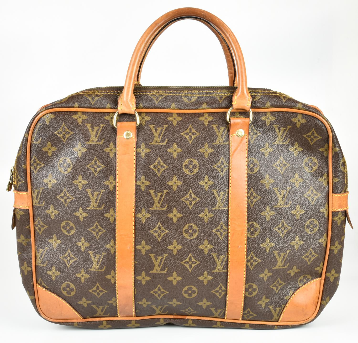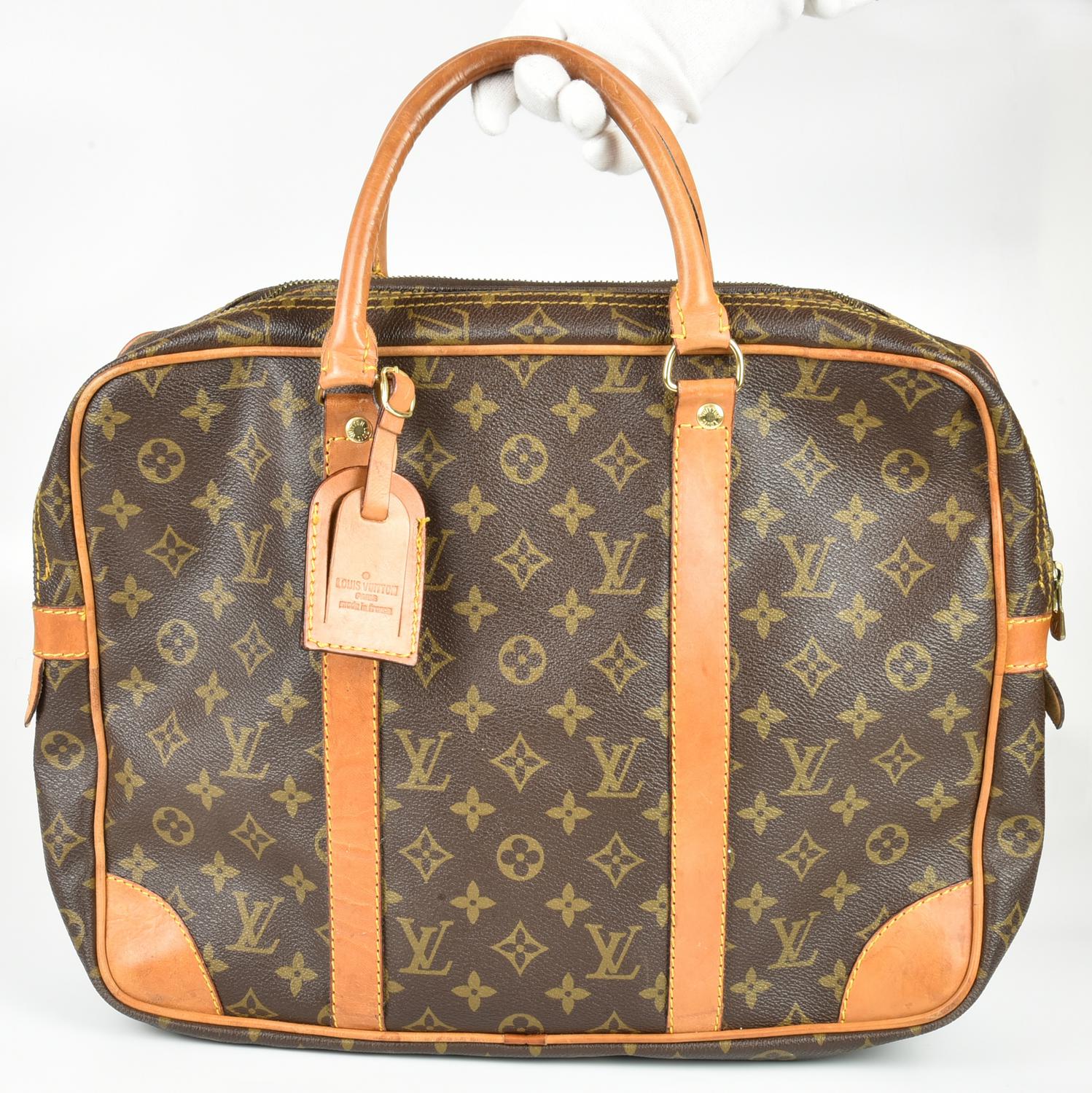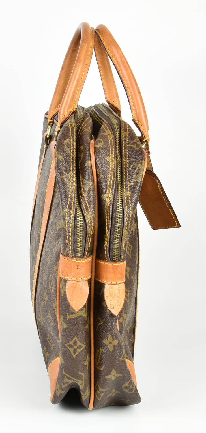 Document holder in monogram canvas with vachetta leather inserts. Features double handles. The interior is organized into two distinct compartments, both secured with zippers, one of which includes a side zipper pocket. Includes an address tag. Gold-tone metal hardware. Dimensions: 40.00 x 30.00 x 11.50 cm. Height including handles: 44.00 cm. Made in France. Shows normal signs of use and aging, but overall condition is good. Well preserved.
