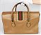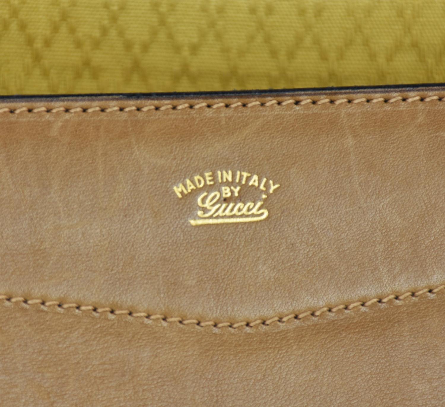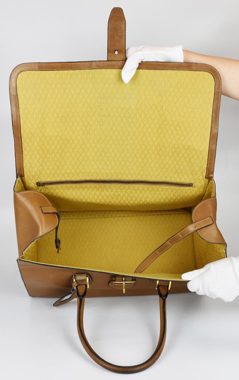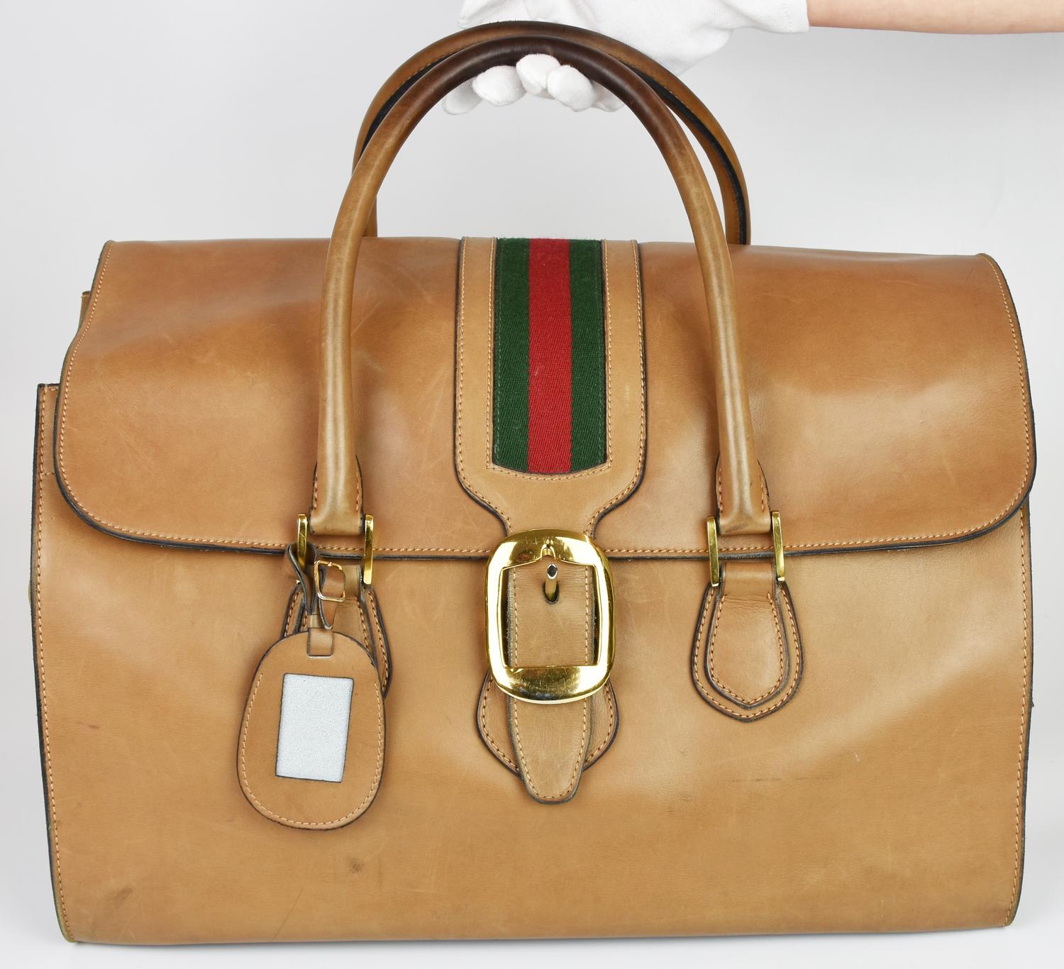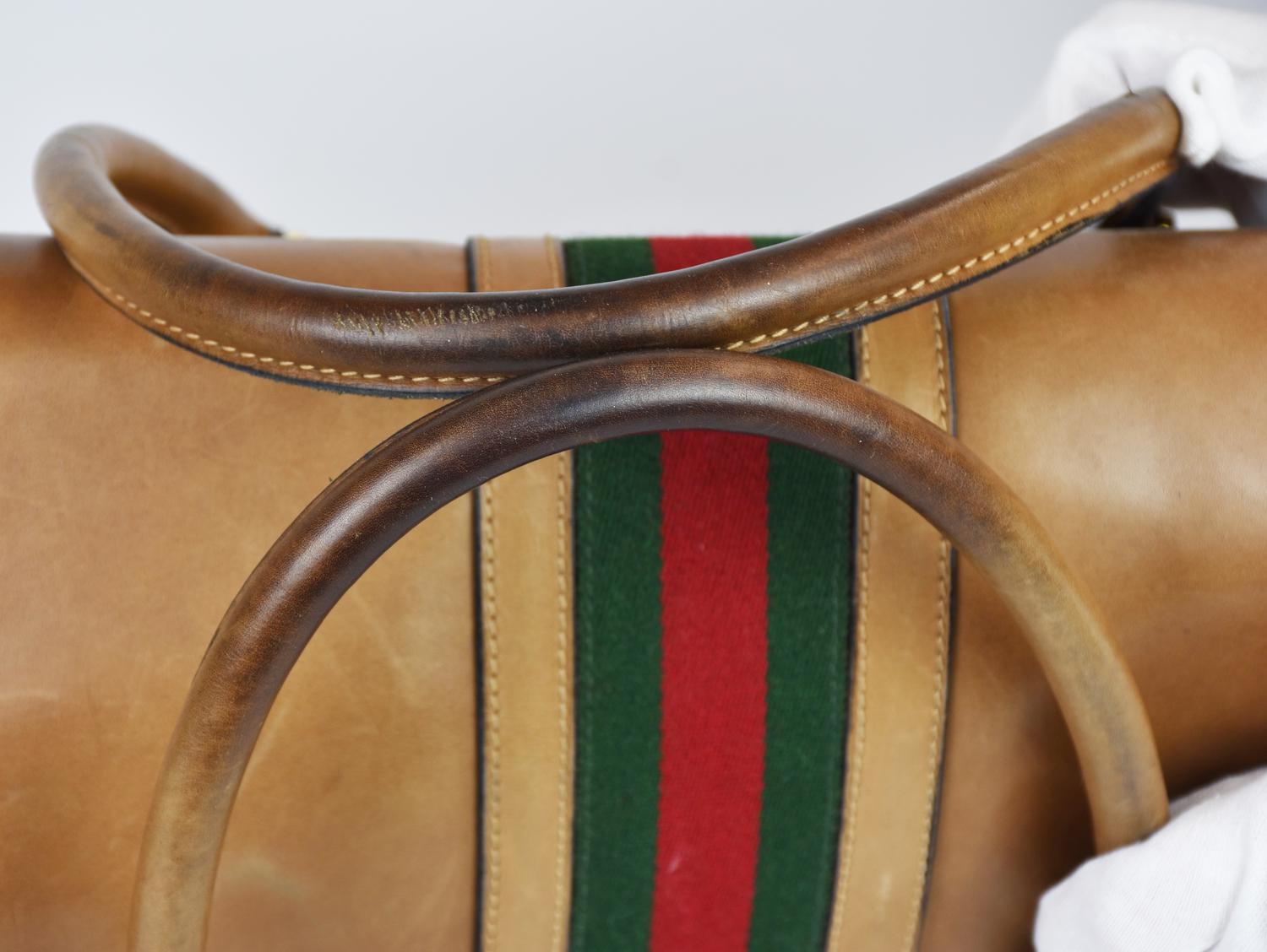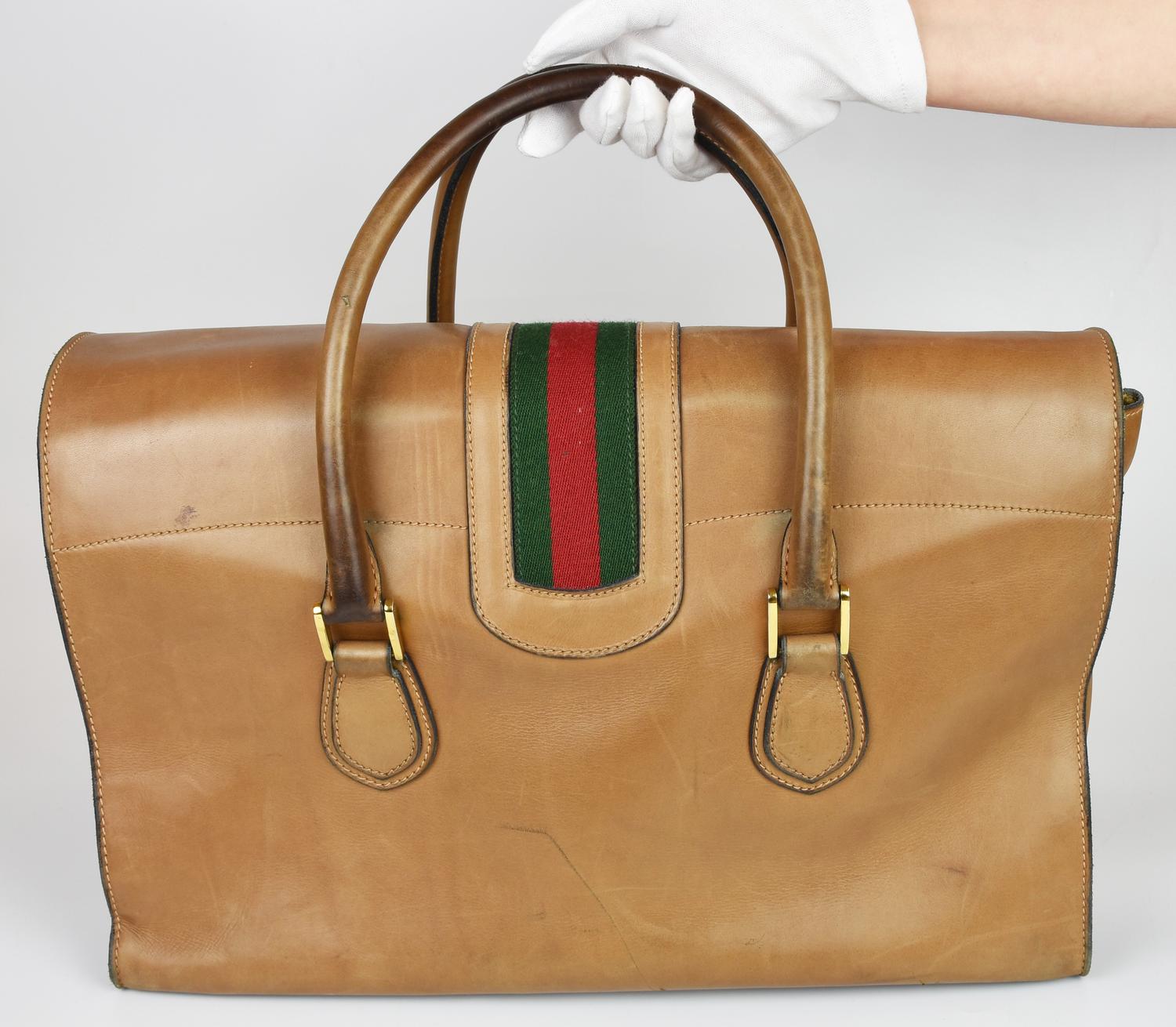 Leather suitcase with Web motif on the front, dating back to the 1960s. Double handles and an attached luggage tag. Front flap closure with a buckle, plus an internal strap. Fabric-lined interior organized in a single compartment with a side zip pocket. Gold-tone metal hardware. Dimensions: 44.00 x 28.00 x 23.00 cm. Handle drop: 42.00 cm. Made in Italy. Shows some stains and signs of age, but overall condition is good. Well-preserved.