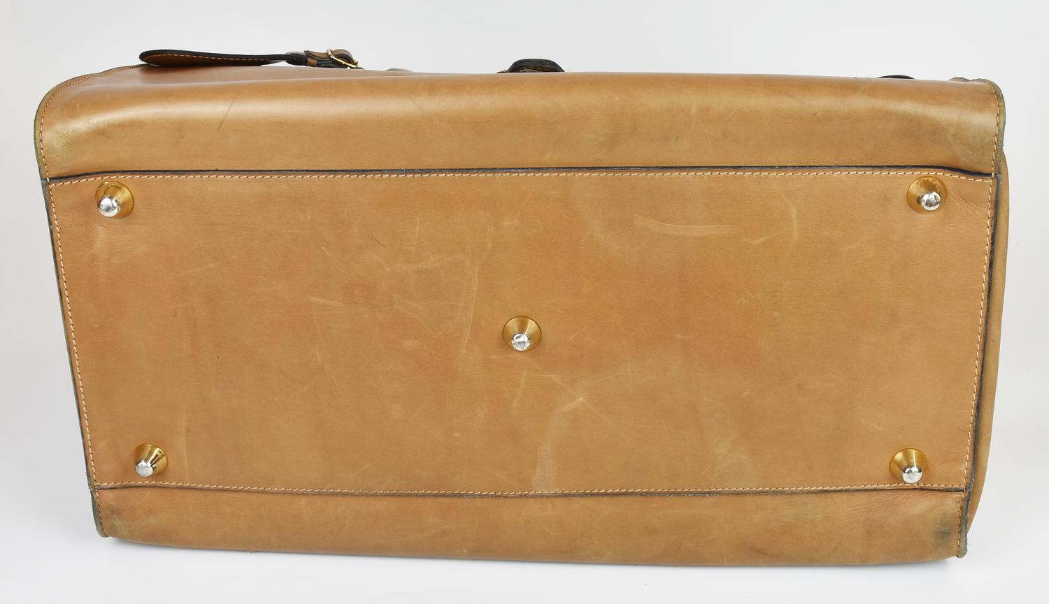 Valigia in pelle con motivo Web nella parte frontale, databile anni ‘60. Doppi manici e tag porta indirizzo. Chiusura frontale con patta e fibbia, più cinghia interna. Interno in tessuto organizzato in un unico vano con taschino laterale con cerniera. Hardware in metallo dorato. Cm 44,00x28,00x23,00. Altezza coi manici cm 42,00. Prodotto in Italia. Presenta qualche macchia e segno del tempo, ma le condizioni generali sono buone. Ben conservata.