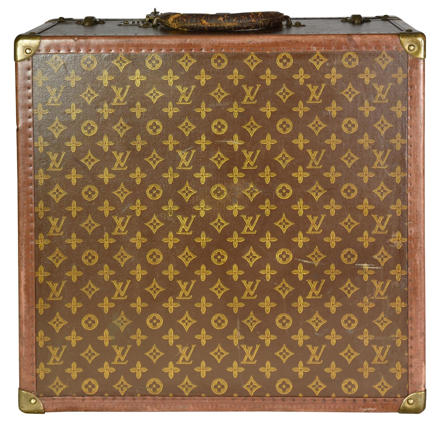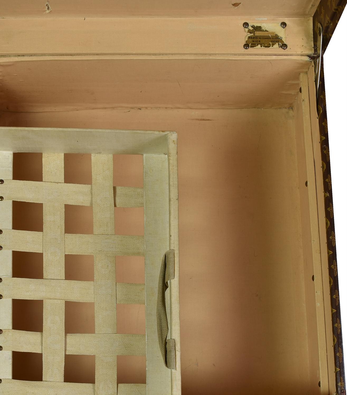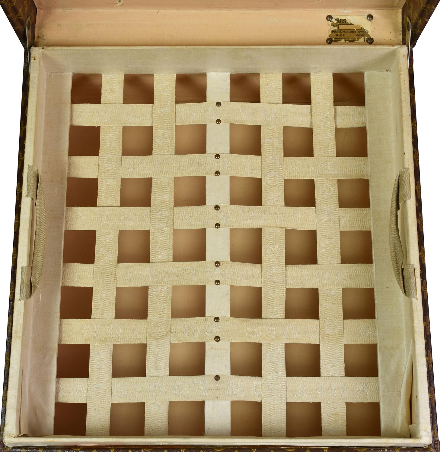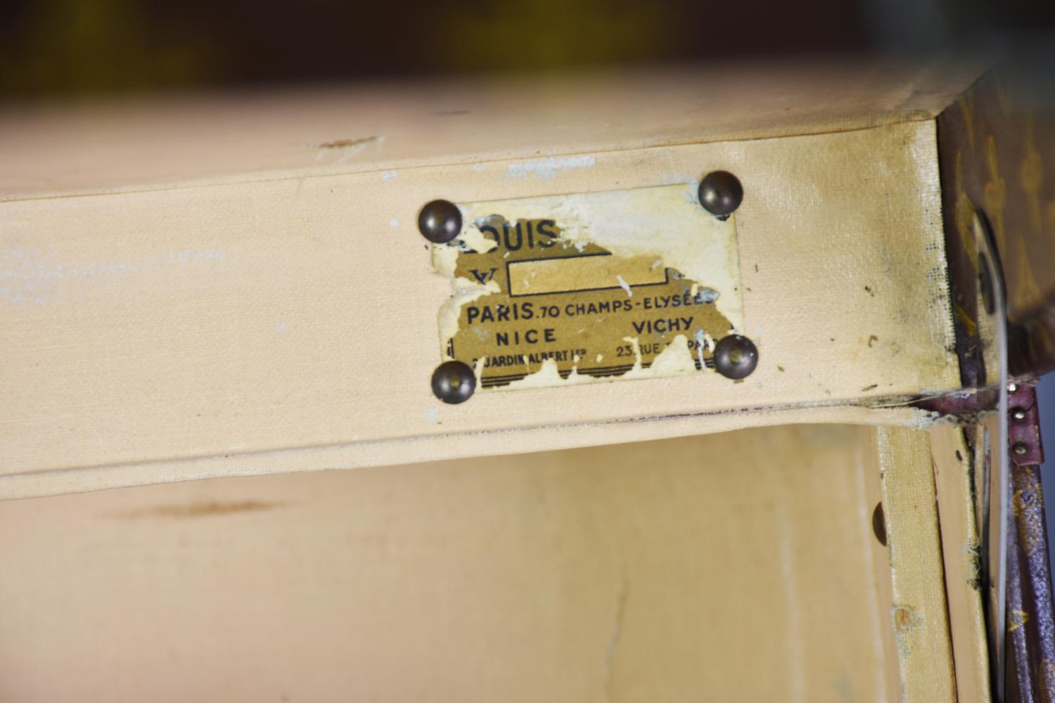 Baule da viaggio d’epoca in legno, rivestito in tela monogram con finiture in pelle e minuteria in ottone. Ancora presente la ‘gabbia a nastro’, ossia il contenitore mobile con telaio in legno su cui e’ teso un nastro di tela. Cm 49,50x23x49. Presenta l’etichetta dello storico negozio al 70, Champs-Elysee. Datato 1940 - 1950. Prodotto in Francia. Presenta difetti e segni del tempo, ma le condizioni generali sono buone. Ben conservato.