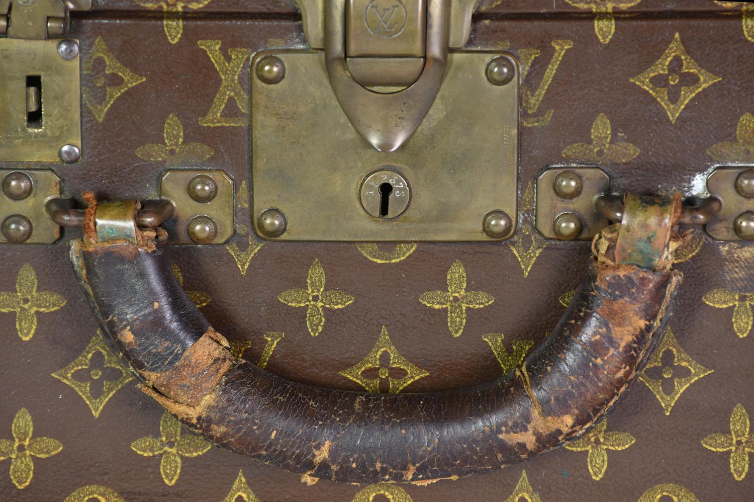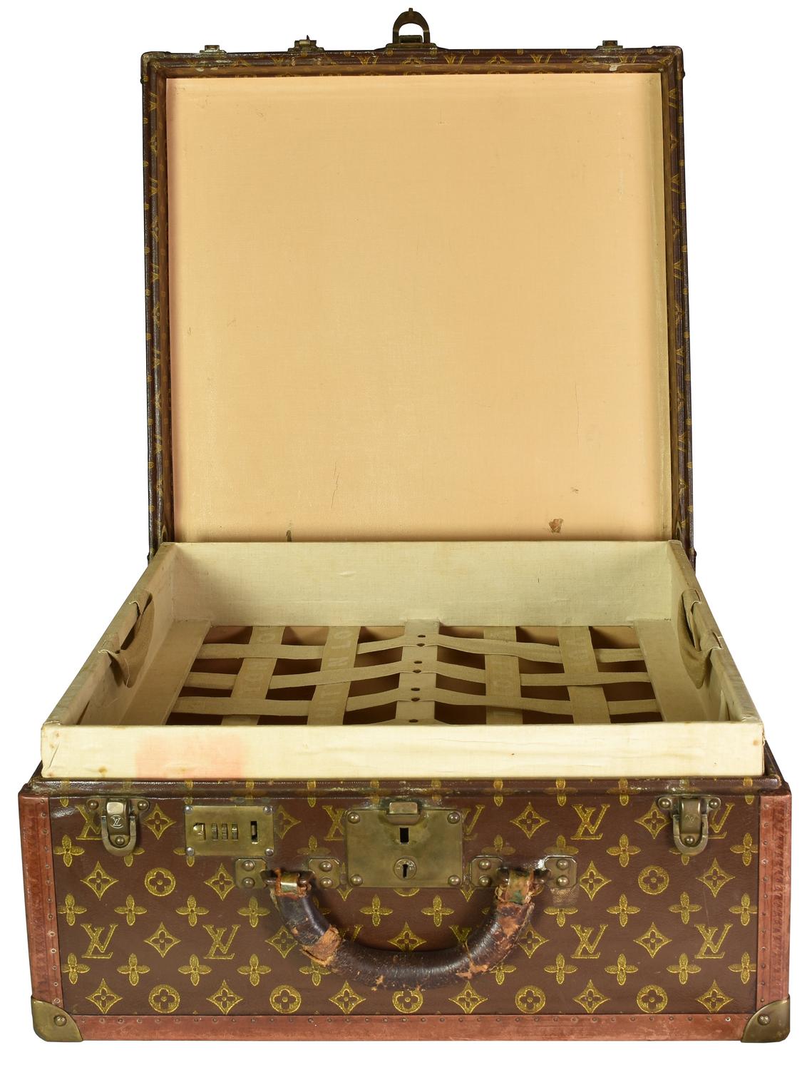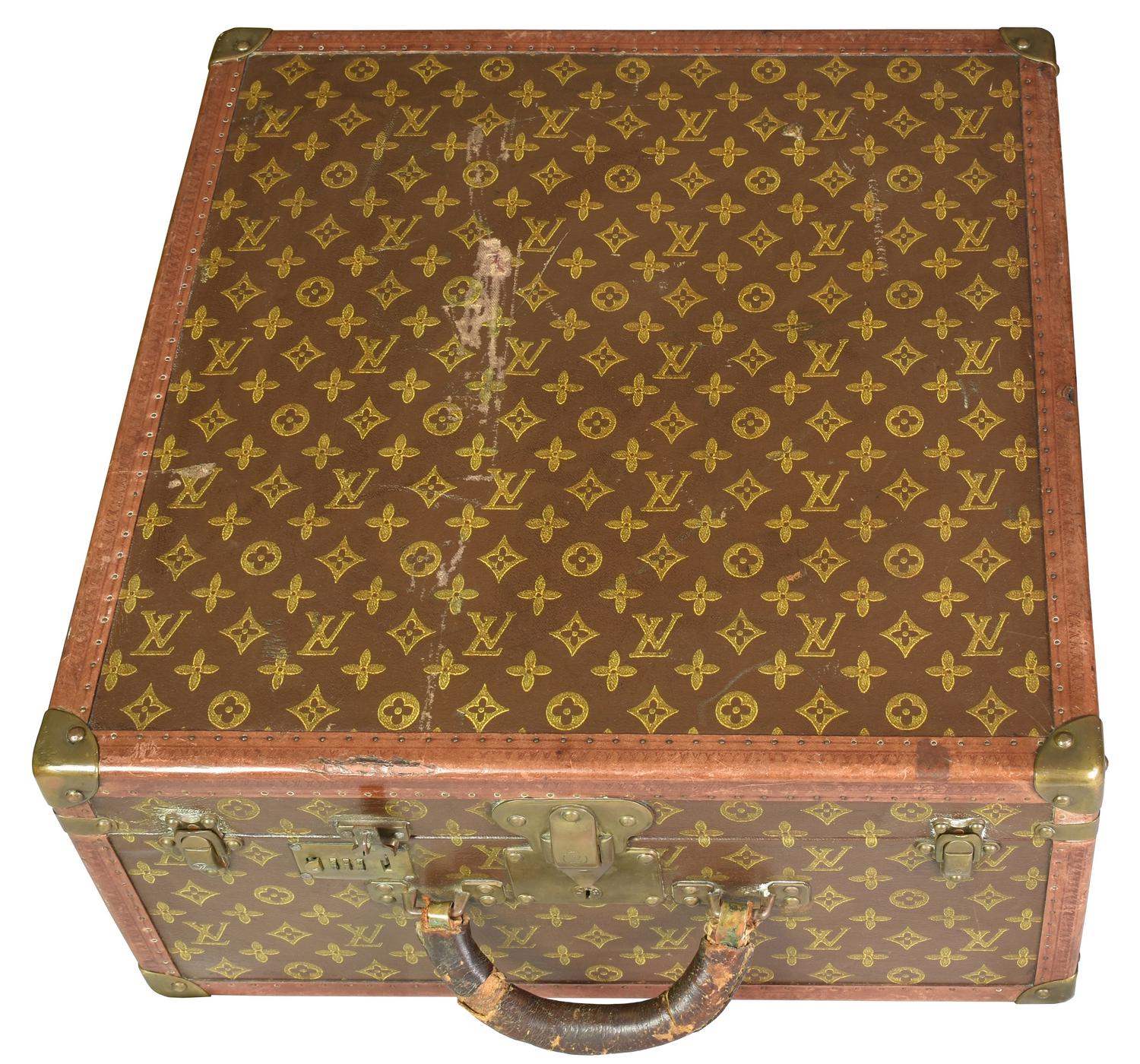 Baule da viaggio d’epoca in legno, rivestito in tela monogram con finiture in pelle e minuteria in ottone. Ancora presente la ‘gabbia a nastro’, ossia il contenitore mobile con telaio in legno su cui e’ teso un nastro di tela. Cm 49,50x23x49. Presenta l’etichetta dello storico negozio al 70, Champs-Elysee. Datato 1940 - 1950. Prodotto in Francia. Presenta difetti e segni del tempo, ma le condizioni generali sono buone. Ben conservato.