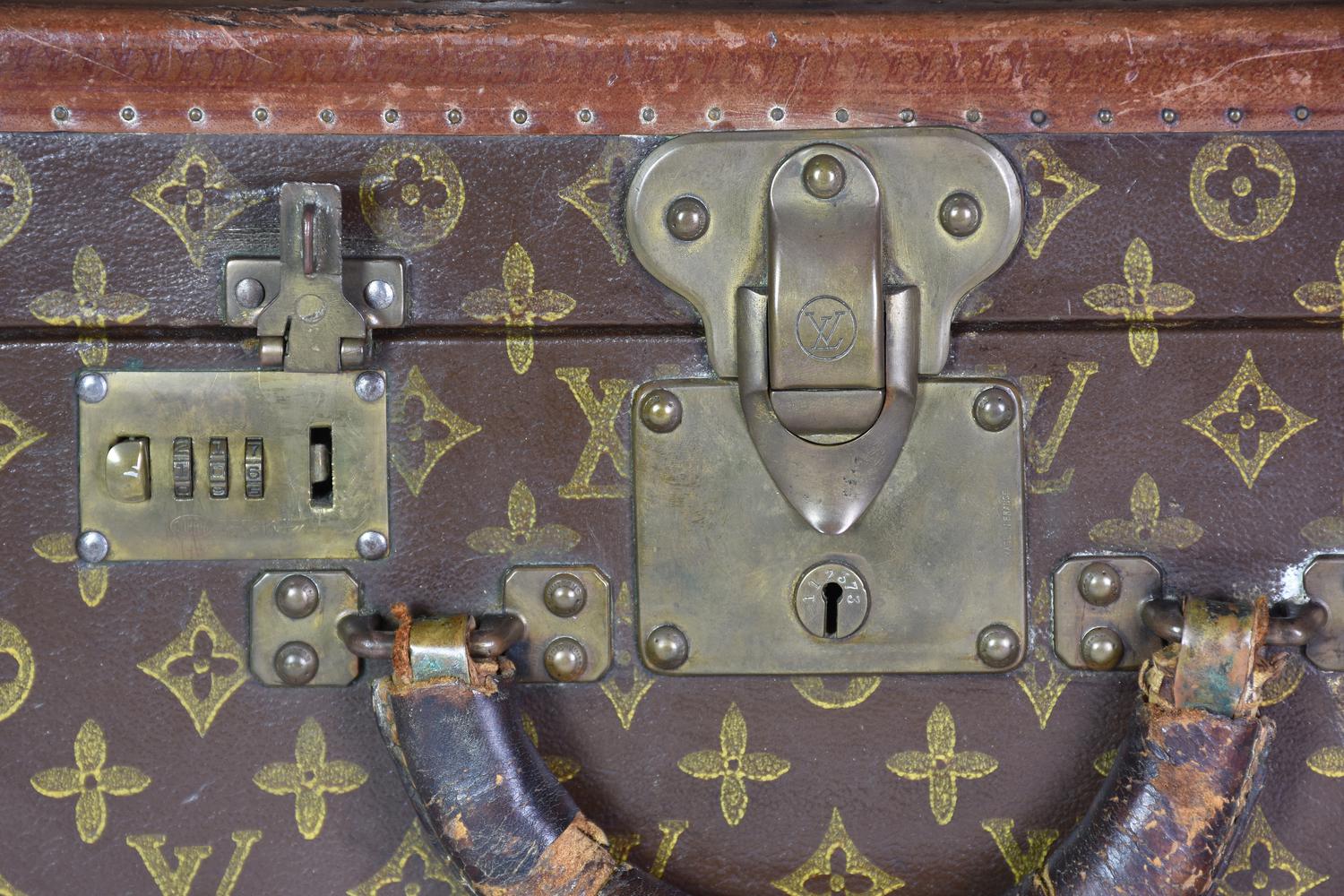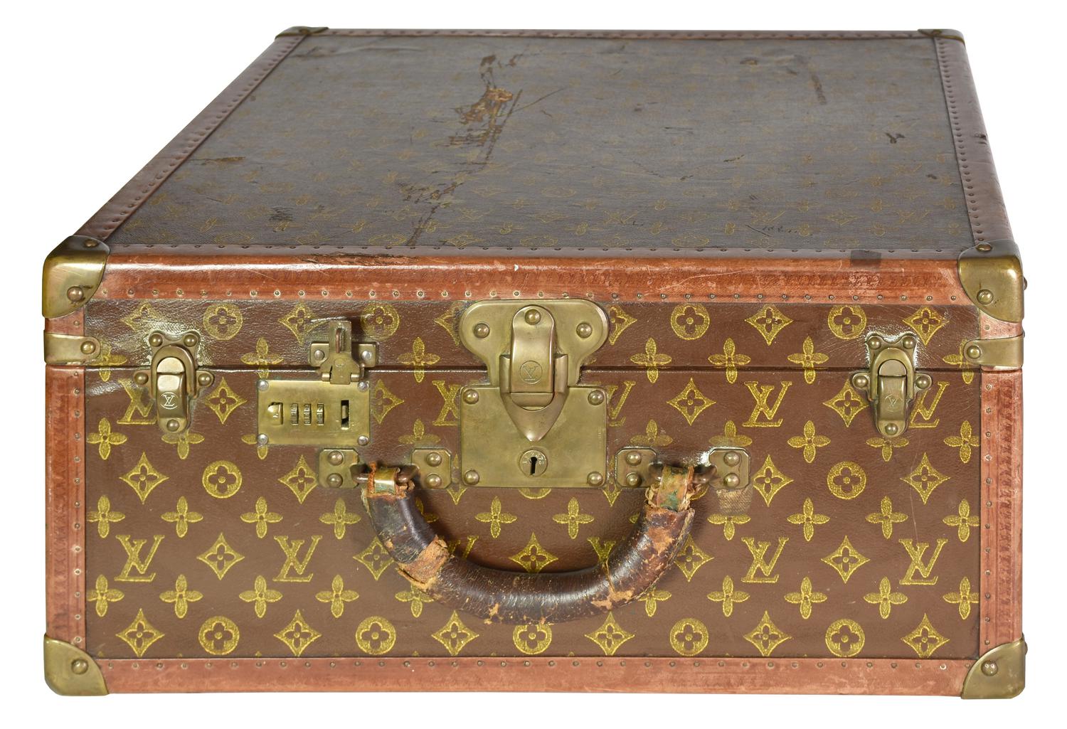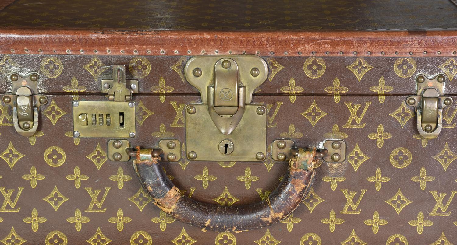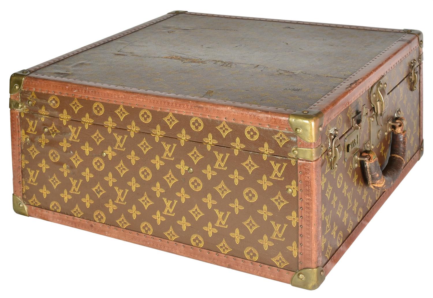 Baule da viaggio d’epoca in legno, rivestito in tela monogram con finiture in pelle e minuteria in ottone. Ancora presente la ‘gabbia a nastro’, ossia il contenitore mobile con telaio in legno su cui e’ teso un nastro di tela. Cm 49,50x23x49. Presenta l’etichetta dello storico negozio al 70, Champs-Elysee. Datato 1940 - 1950. Prodotto in Francia. Presenta difetti e segni del tempo, ma le condizioni generali sono buone. Ben conservato.