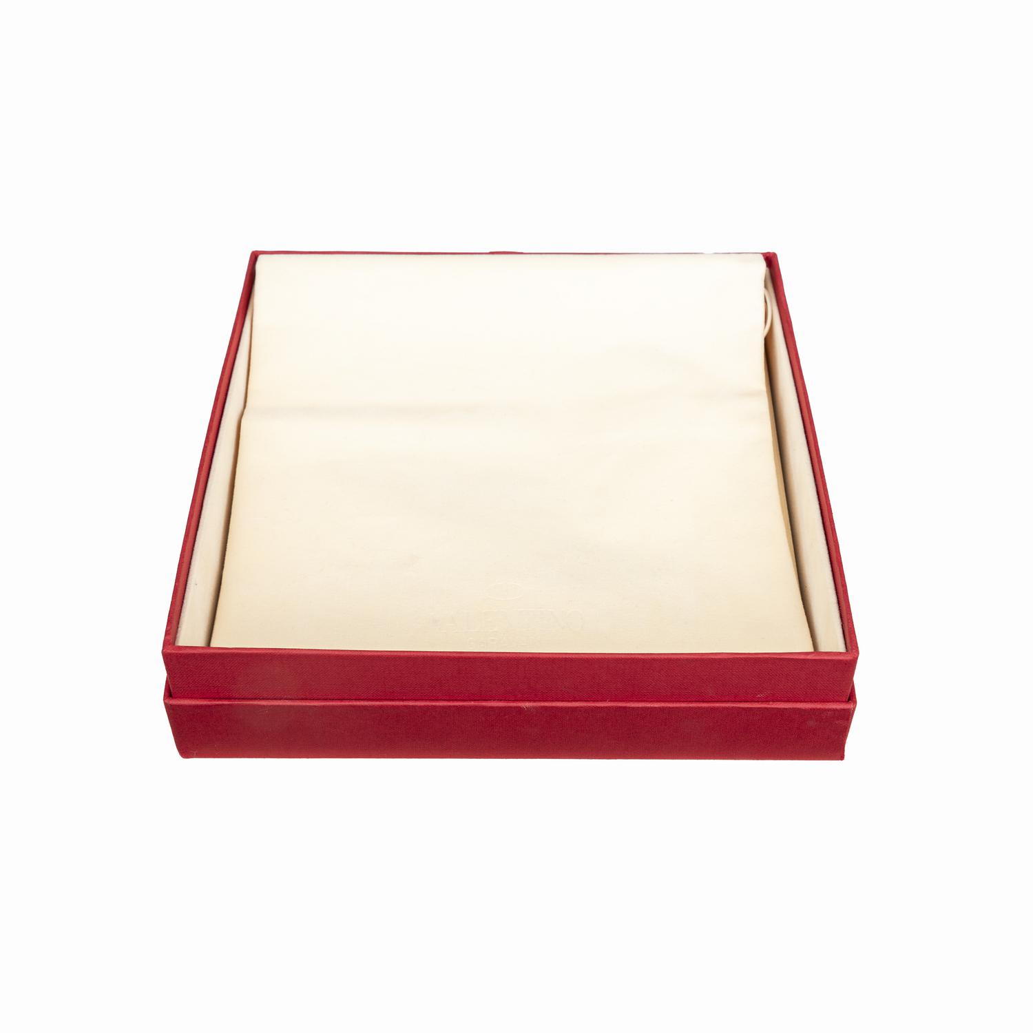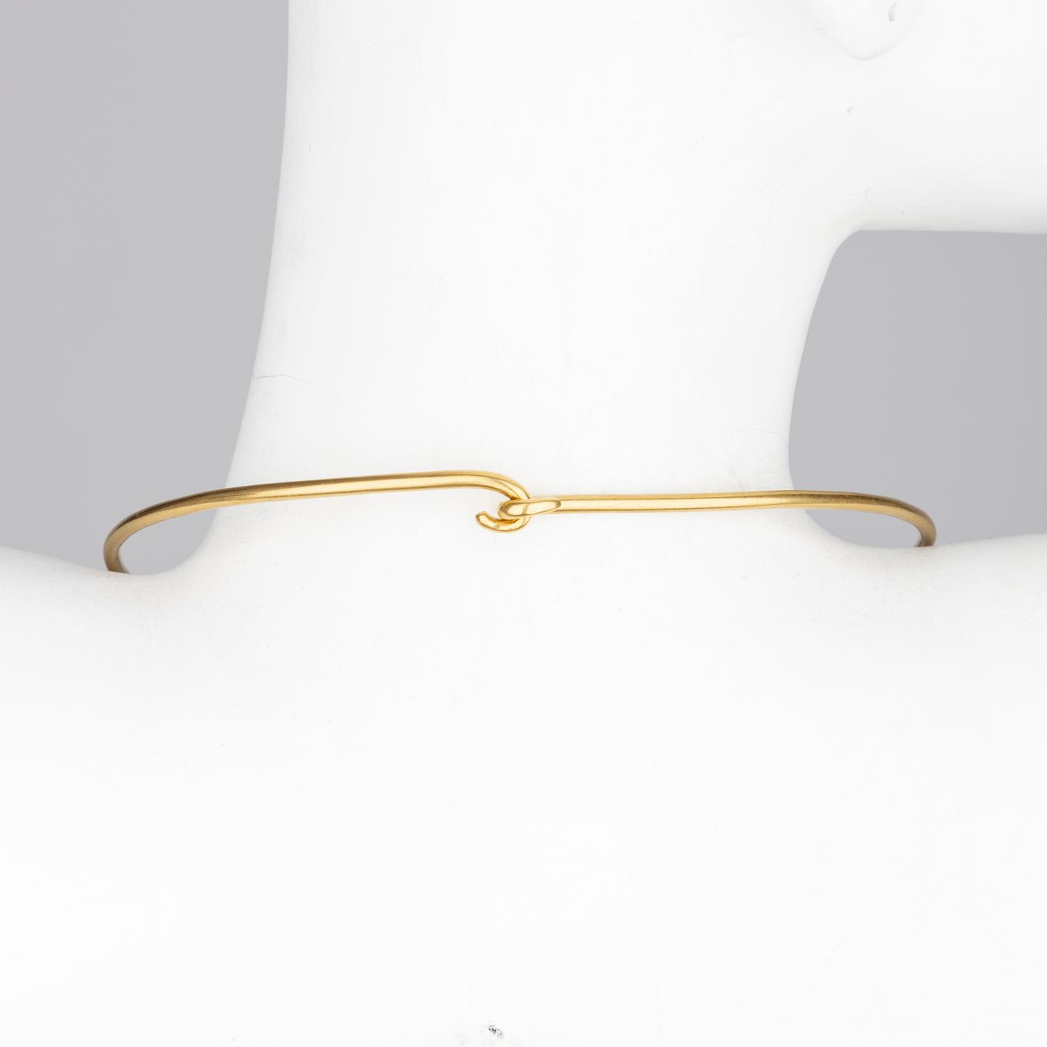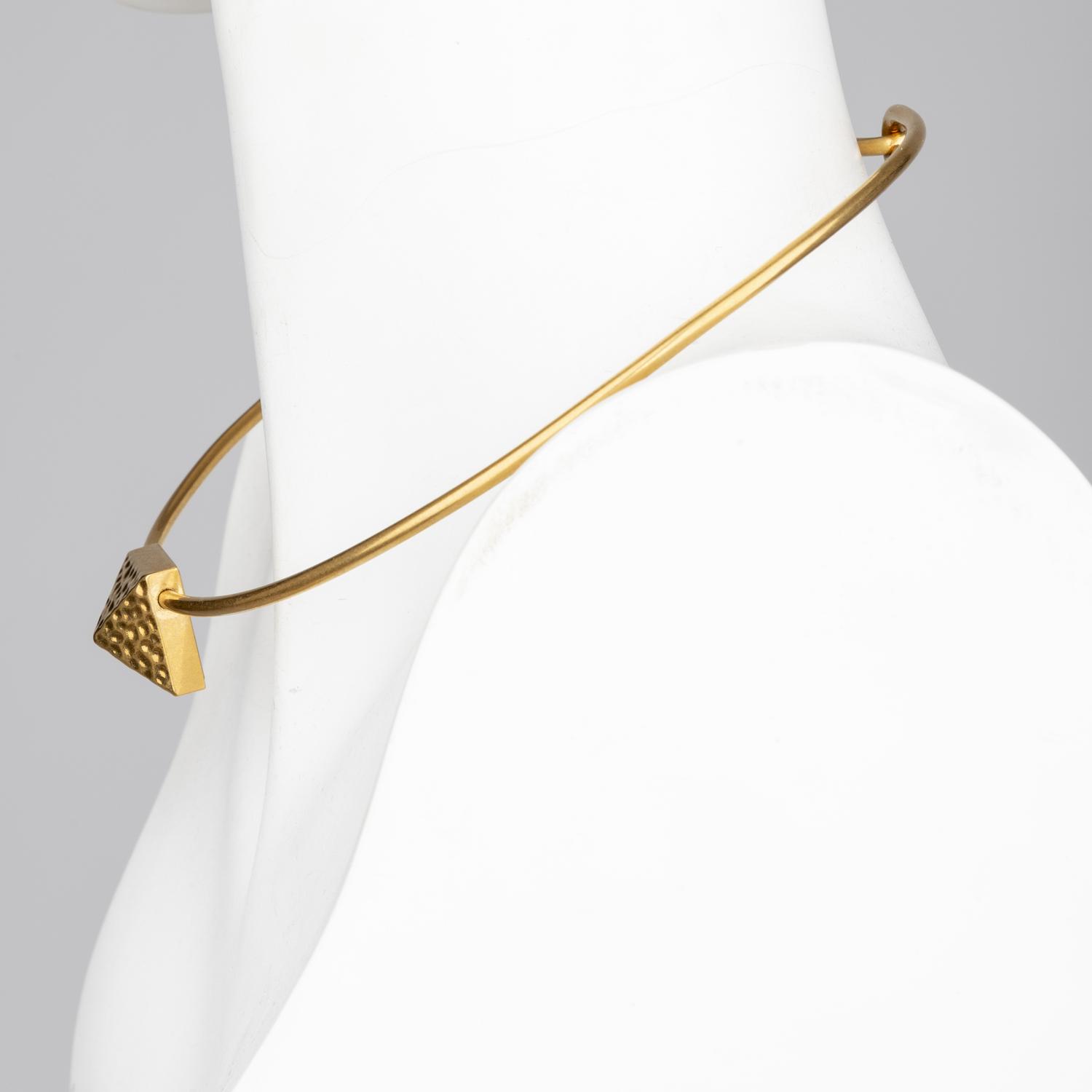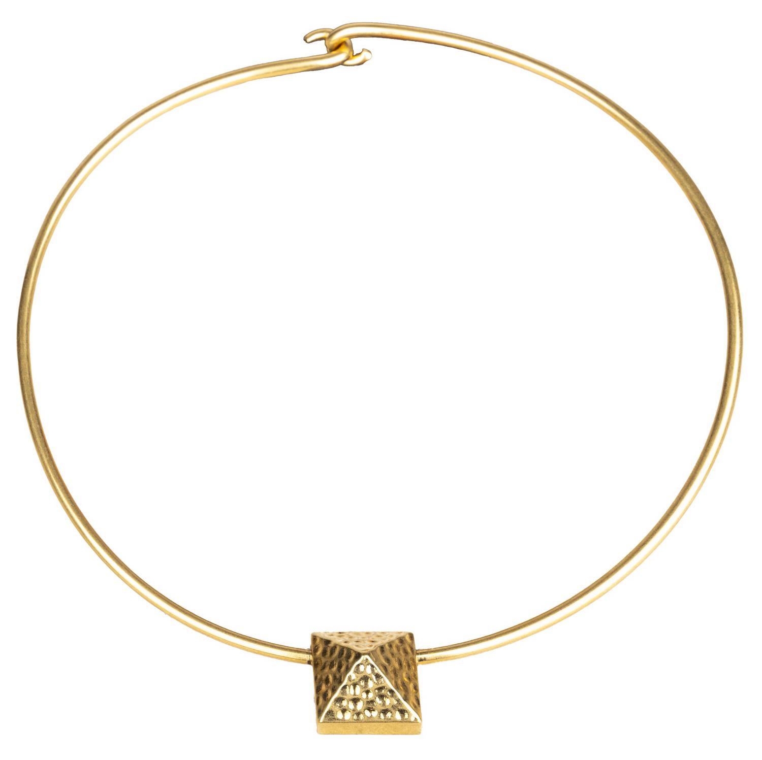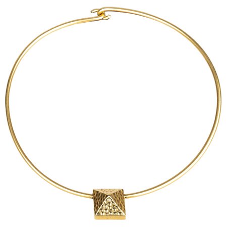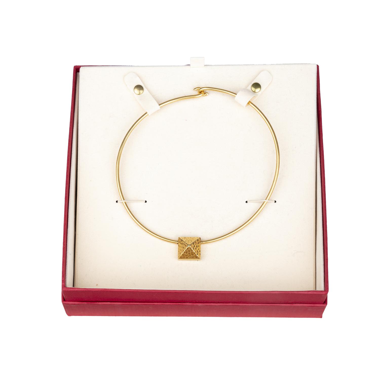 Elevate your look with the Valentino Choker Necklace. Made from gold plated metal, this choker style necklace features a striking pyramid pendant with textured metal at the center. The V logo and "made in Italy" engraving on the back add a touch of luxury. Secure it with the easy hook closure and stand out in style. Diameter: 14 cm. Inclusion: Box, dust bag. Excellent.