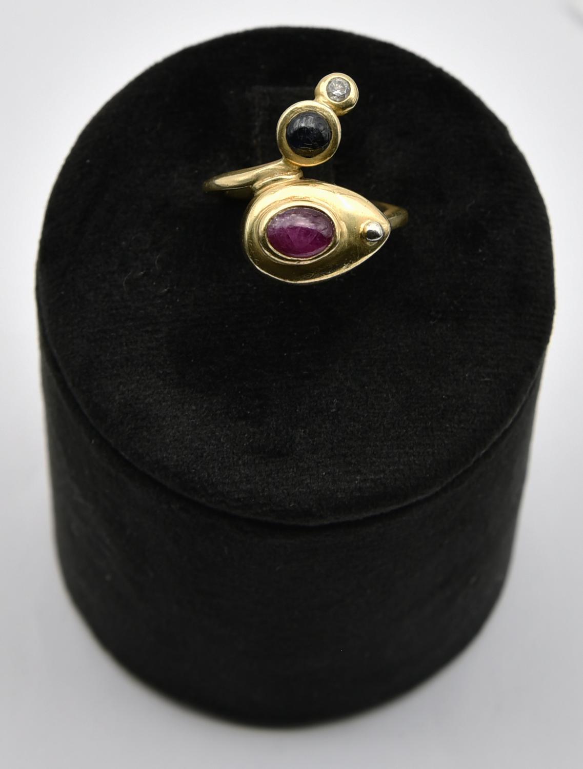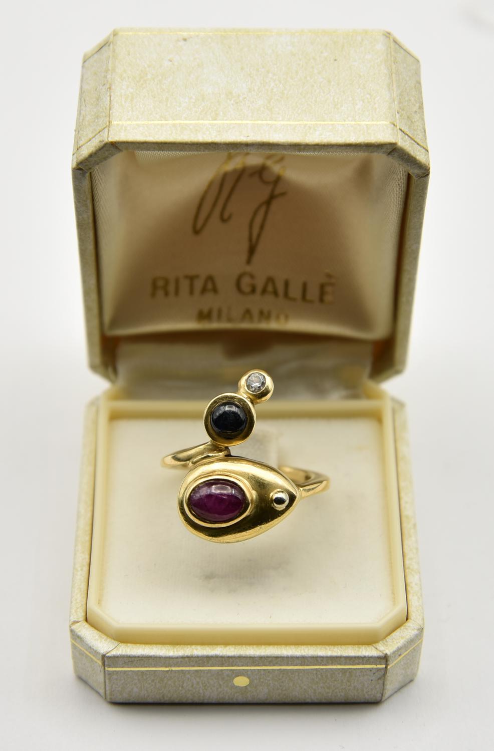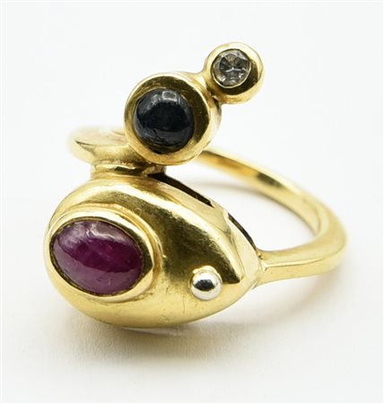 (Caltanissetta 1931 – Oaxaca, Messico 2009) - ANELLO IN ORO GIALLO, RUBINO, ZAFFIRO BIANCO E PIETRA DURA