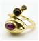 particolare anello in oro giallo realizzato a contrarie' con incastonato un rubino cabochon, una pietra dura e un piccolo zaffiro bianco