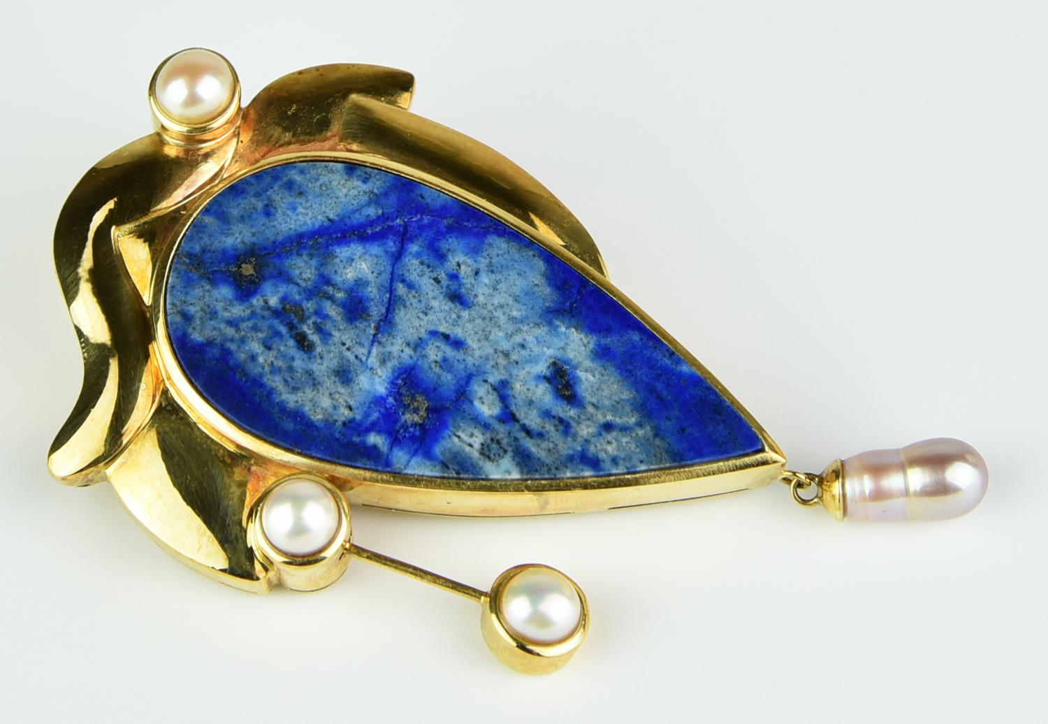 particolare spilla-ciondolo con grande inserto in lapislazuli sagomato a goccia il tutto impreziosito da tre piccole perle (diam. mm 6 ca.), più una perla pendente