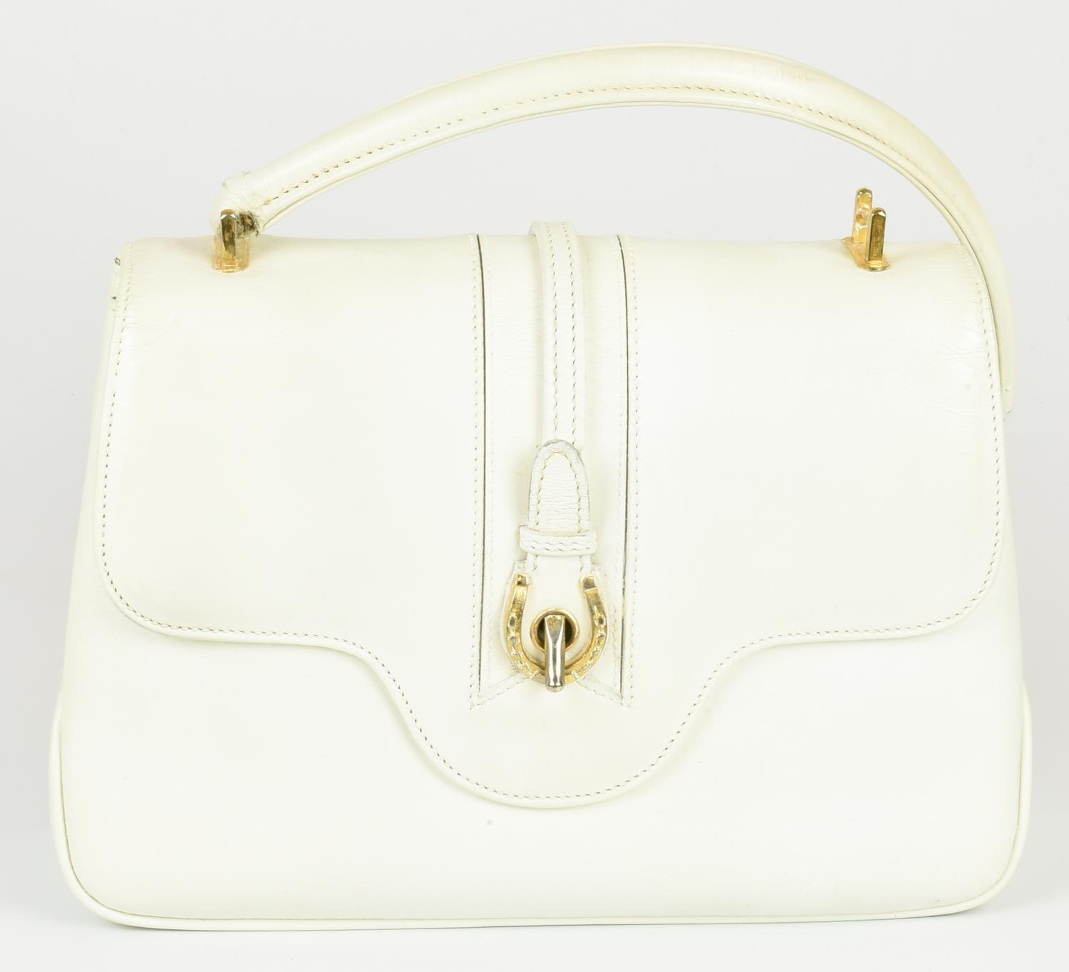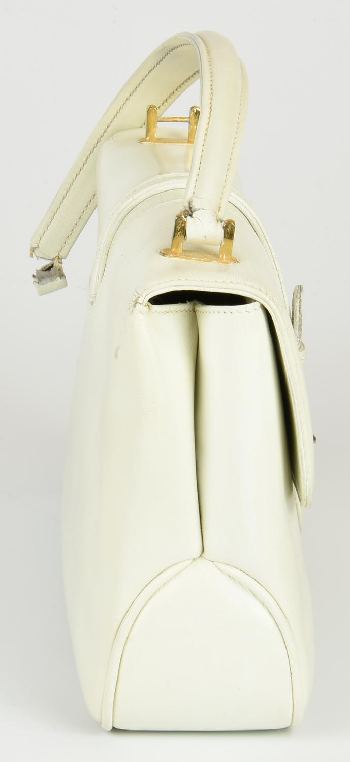 White leather handbag dating back to the 1960s. Single handle and front flap closure with a horseshoe-shaped metal insert. Interior organized in a single compartment with three side pockets: two flat and one with a zip. Gold-tone metal hardware. Dimensions: 24.00 x 18.00 x 6.50 cm. Product reference code: 23.358. Made in Italy. Handle defect as shown in the photos. Fairly well-preserved.