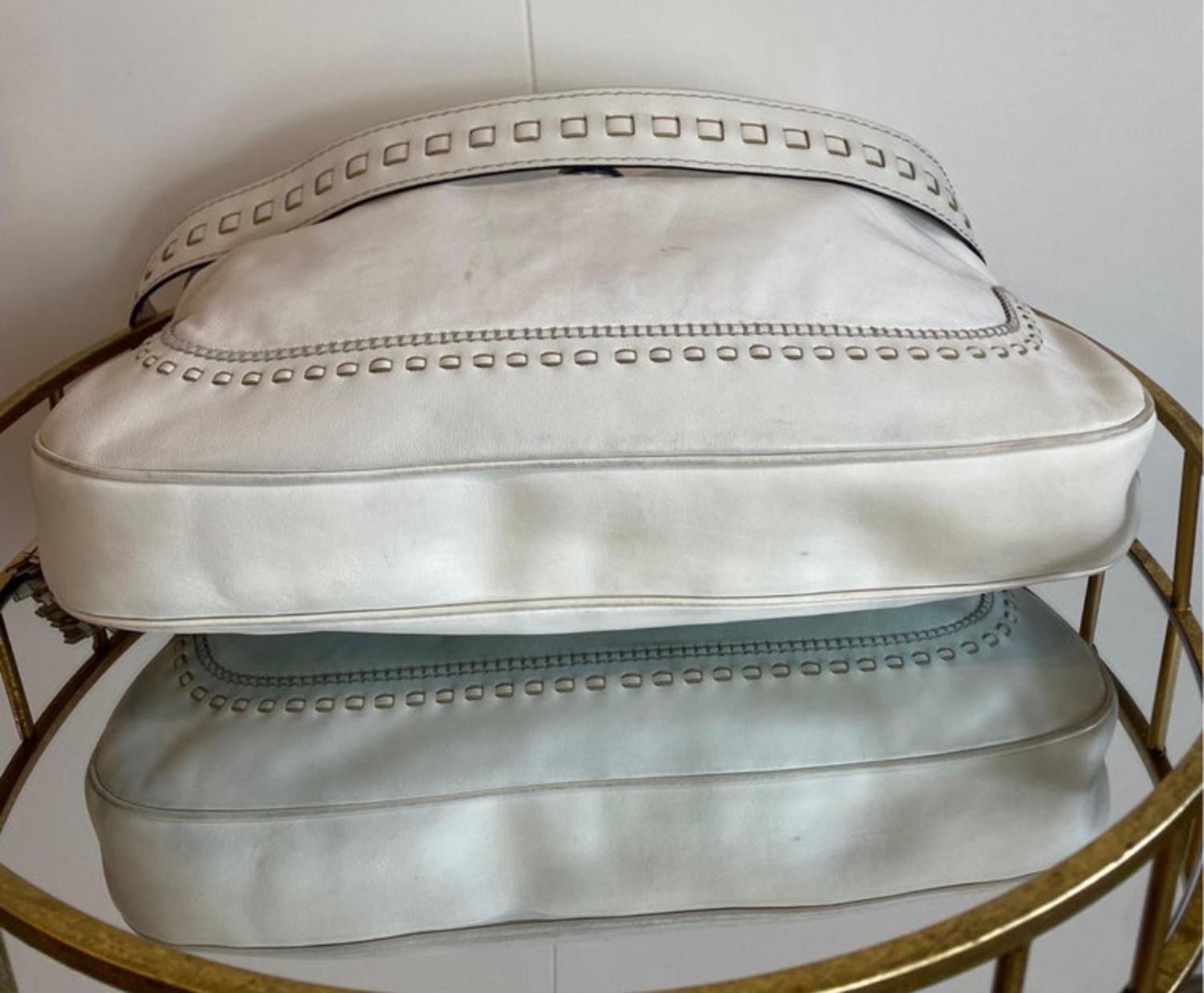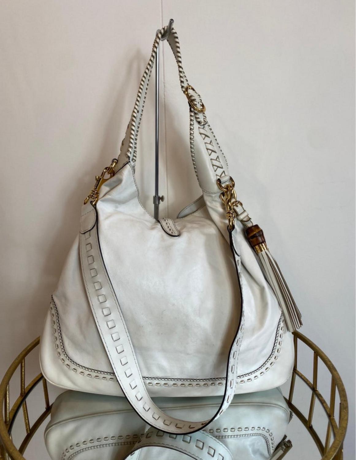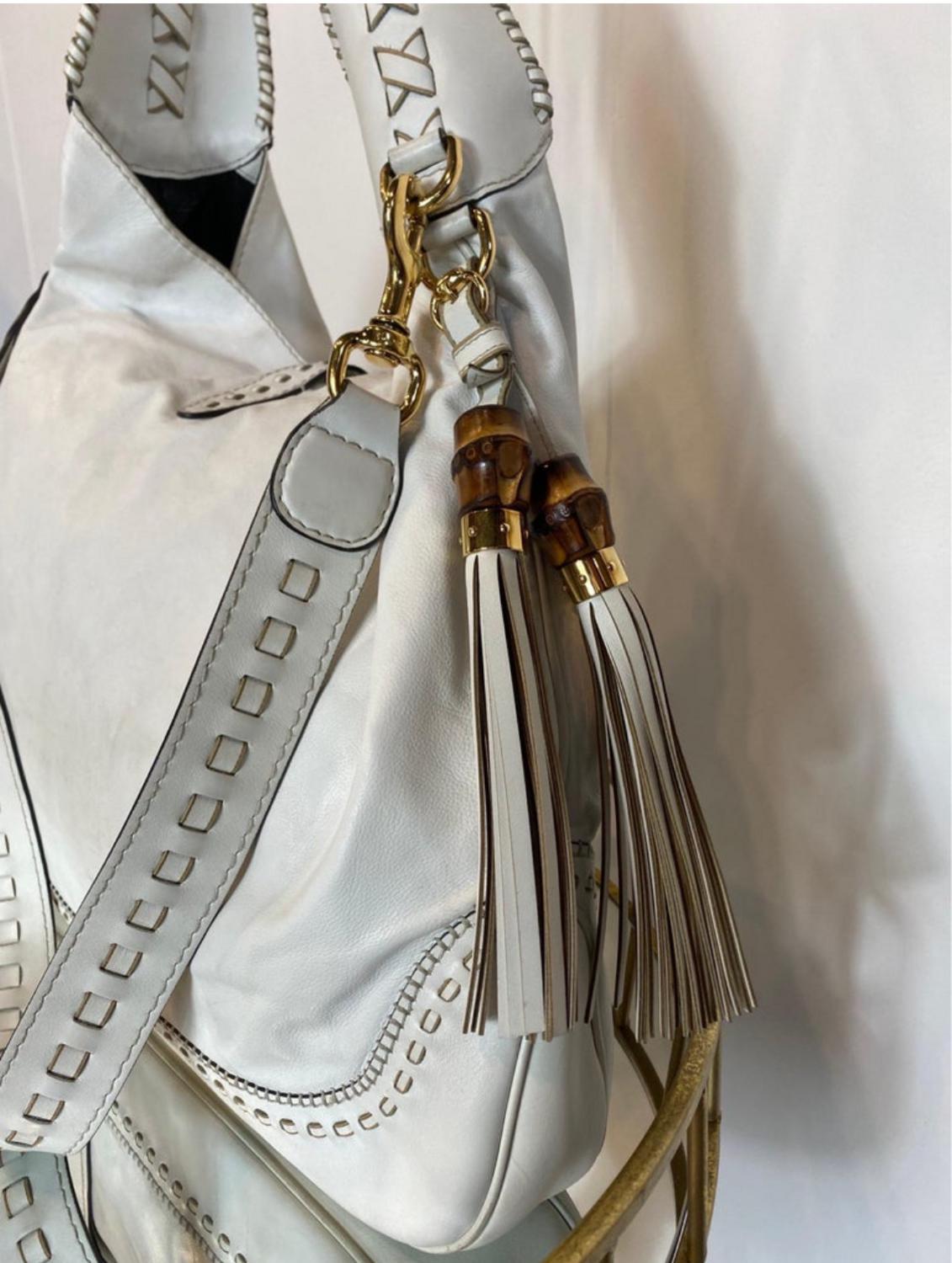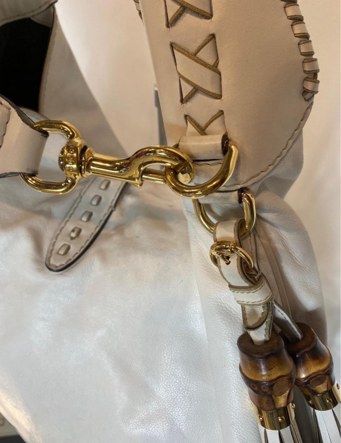 In good general condition, being white in some places there are light stains as shown in the photos, due to normal use. Borsa New Jackie large bamboo bianca. Collezione 2009, disegnata da Frida Giannini