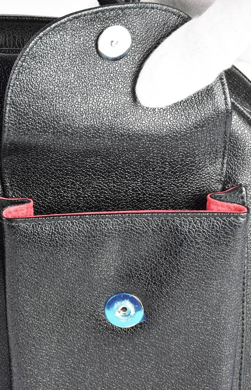 Borsa a mano in pelle nera a due manici, chiusura con cerniera. Interno color lampone, organizzato in un ampio vano e due taschini laterali, uno a soffietto e uno con cerniera. All’esterno reca due tasche frontali con chiusura magnetica. Hardware in metallo cromato inciso col logo della Maison. Cm 39x23x13. Altezza coi manici cm 39. Corredata di dustbag originale. Codice riferimento prodotto: BNMLLG. Prodotto in Italia. Eccellente, pari al nuovo, reca ancora le pellicole di protezione sulle chiusure delle tasche esterne.
