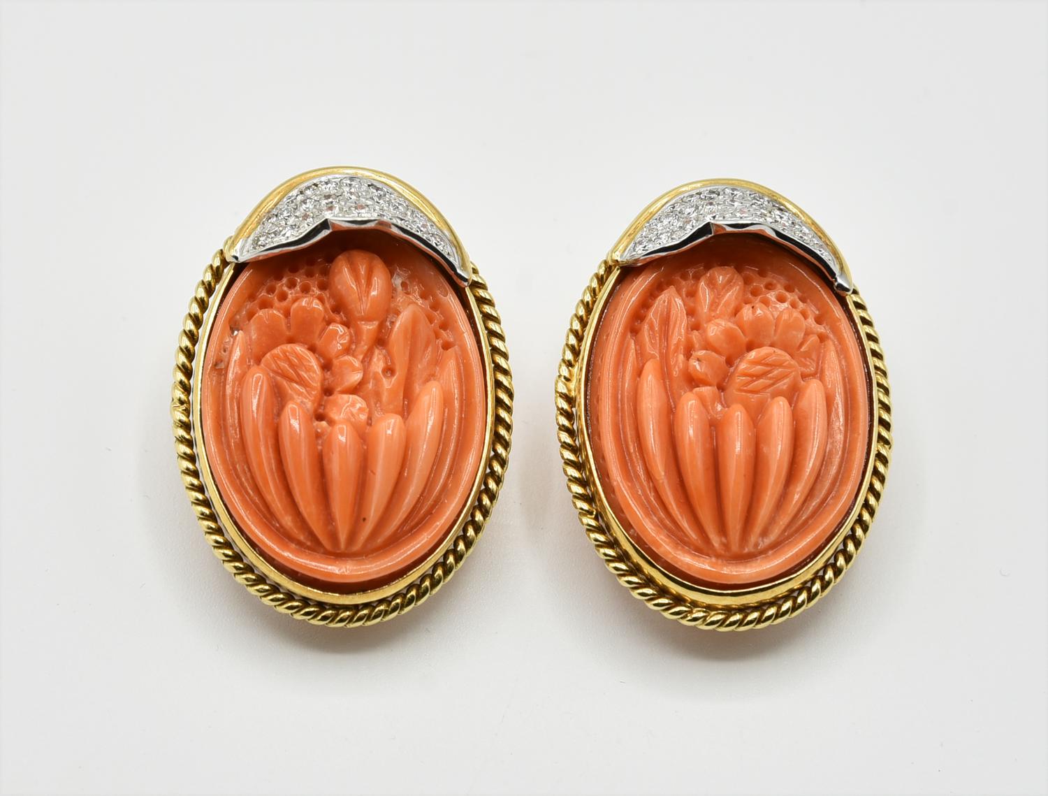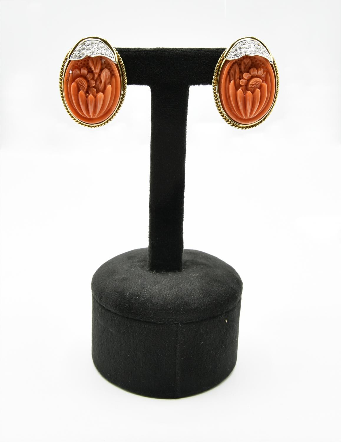 importanti orecchini con corallo intagliato artigianalmente montato su oro giallo, il tutto impreziosito da piccolo pave’ di brillantini per ct 0,78; clip di chiusura in oro bianco