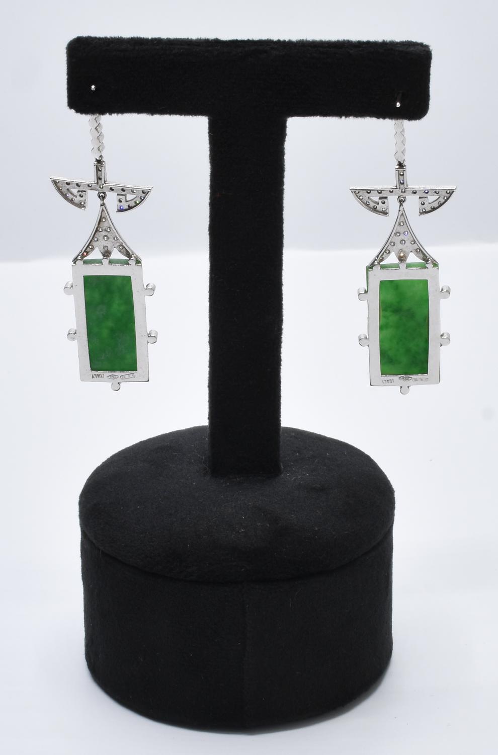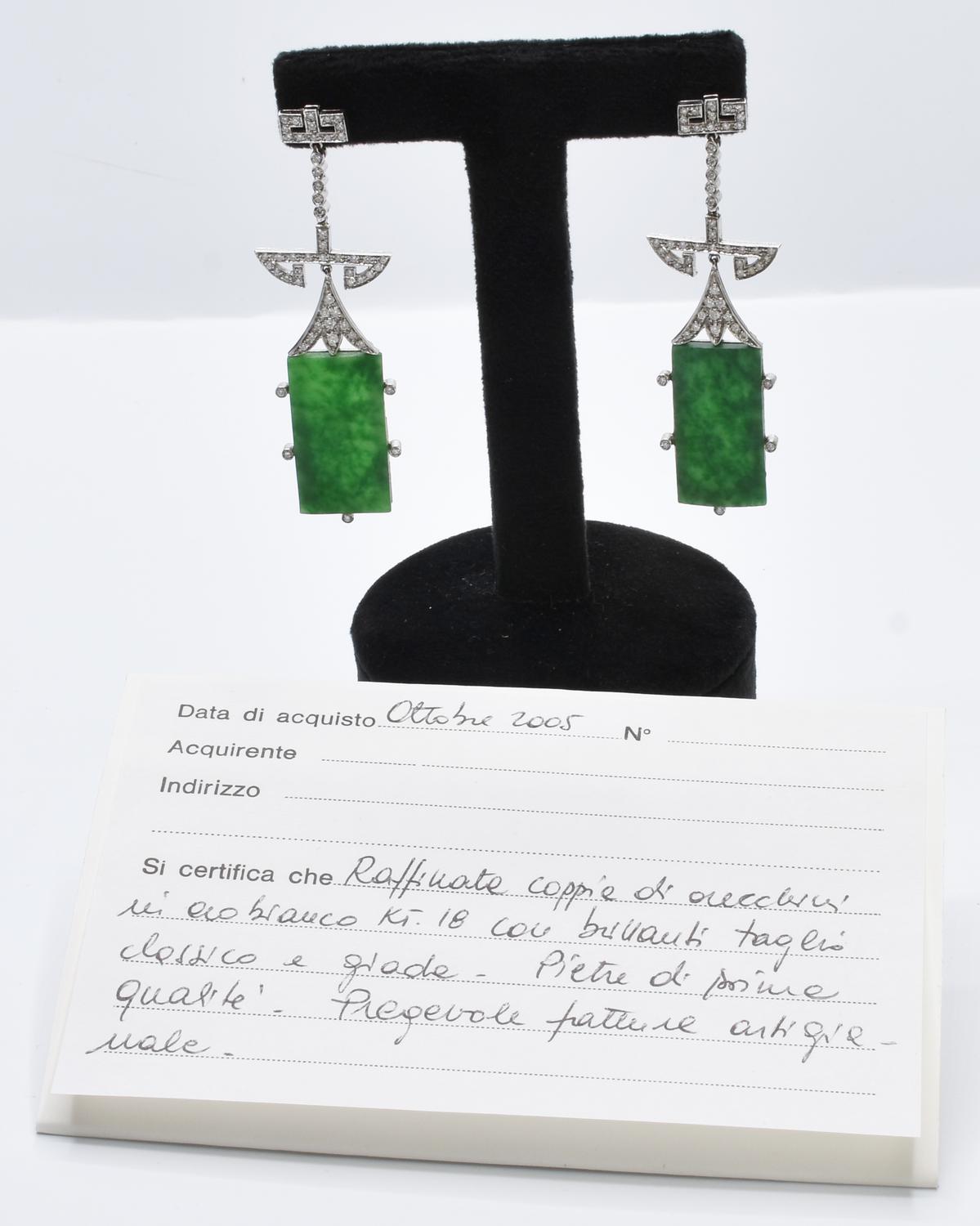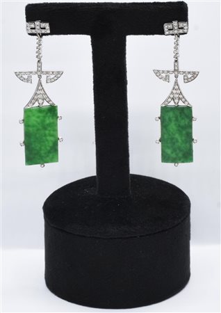 Raffinata coppia di orecchini in oro bianco 18K con brillanti taglio classico e giada. Pregevole fattura artigianale. Peso: 15gr. Corredata da documentazione di provenienza. Provenienza Antichità San Federico Torino.