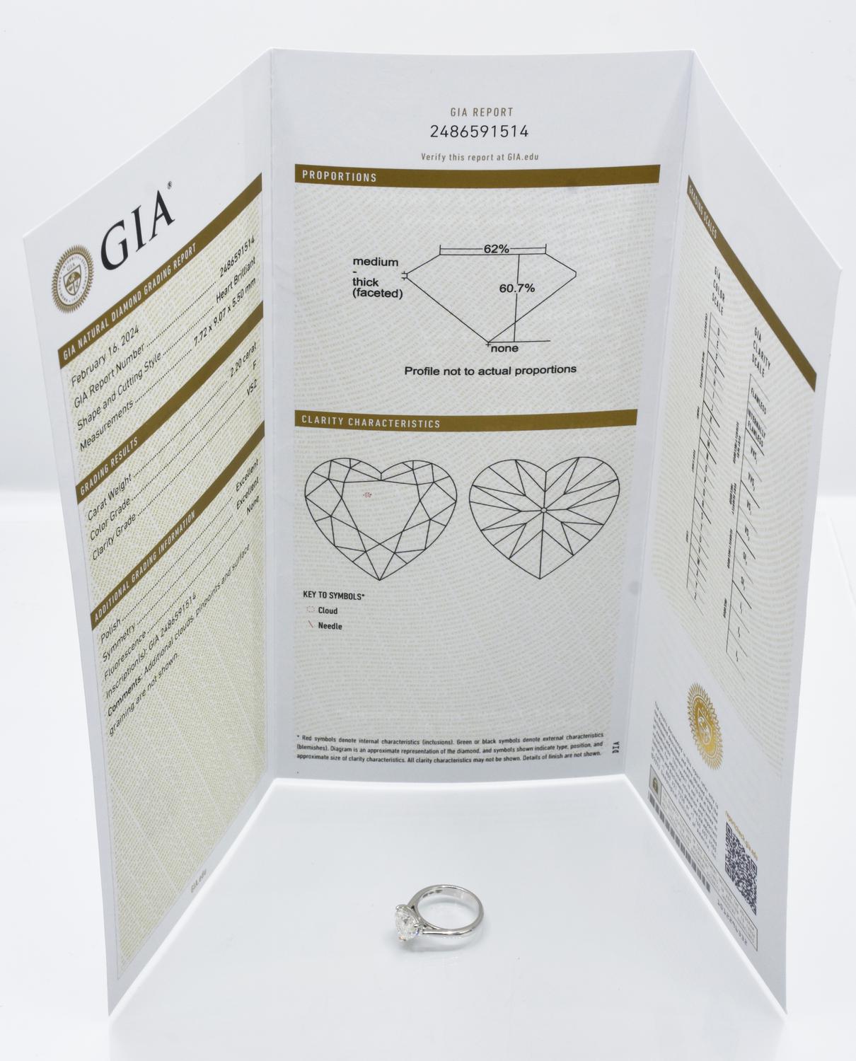 18K white gold ring featuring a natural heart-shaped brilliant-cut diamond. Weight: 2.2 ct. Color: F. Clarity: VS2. Fluorescence: none. GIA certificate issued in the U.S. on 02/16/2024: 2486591514. Size: 9 (resizing available). Weight: 4.1 g.