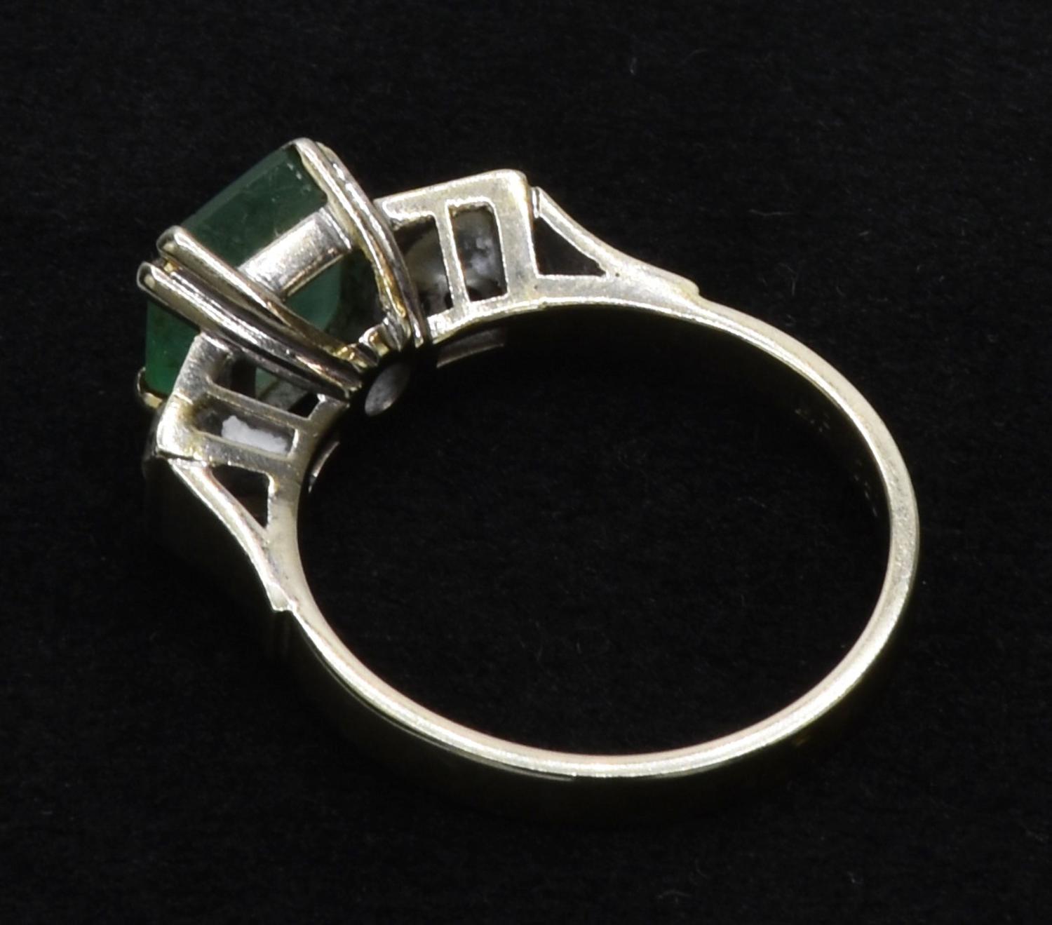 Anello in oro bianco champagne 18 ct con smeraldo naturale taglio quadrato di dimensioni: 7.22x7.05x3.81 mm. Con due diamanti naturali laterali taglio antico per circa 0.40 ct totali. Misura 14. Peso 3.8 gr.