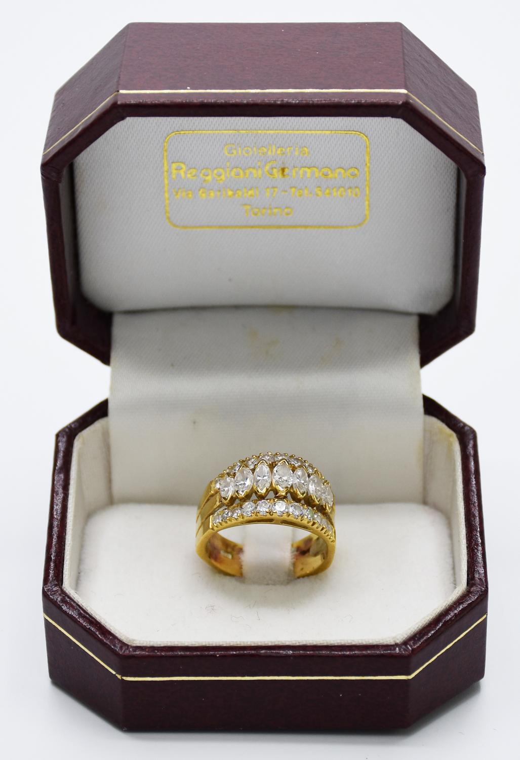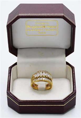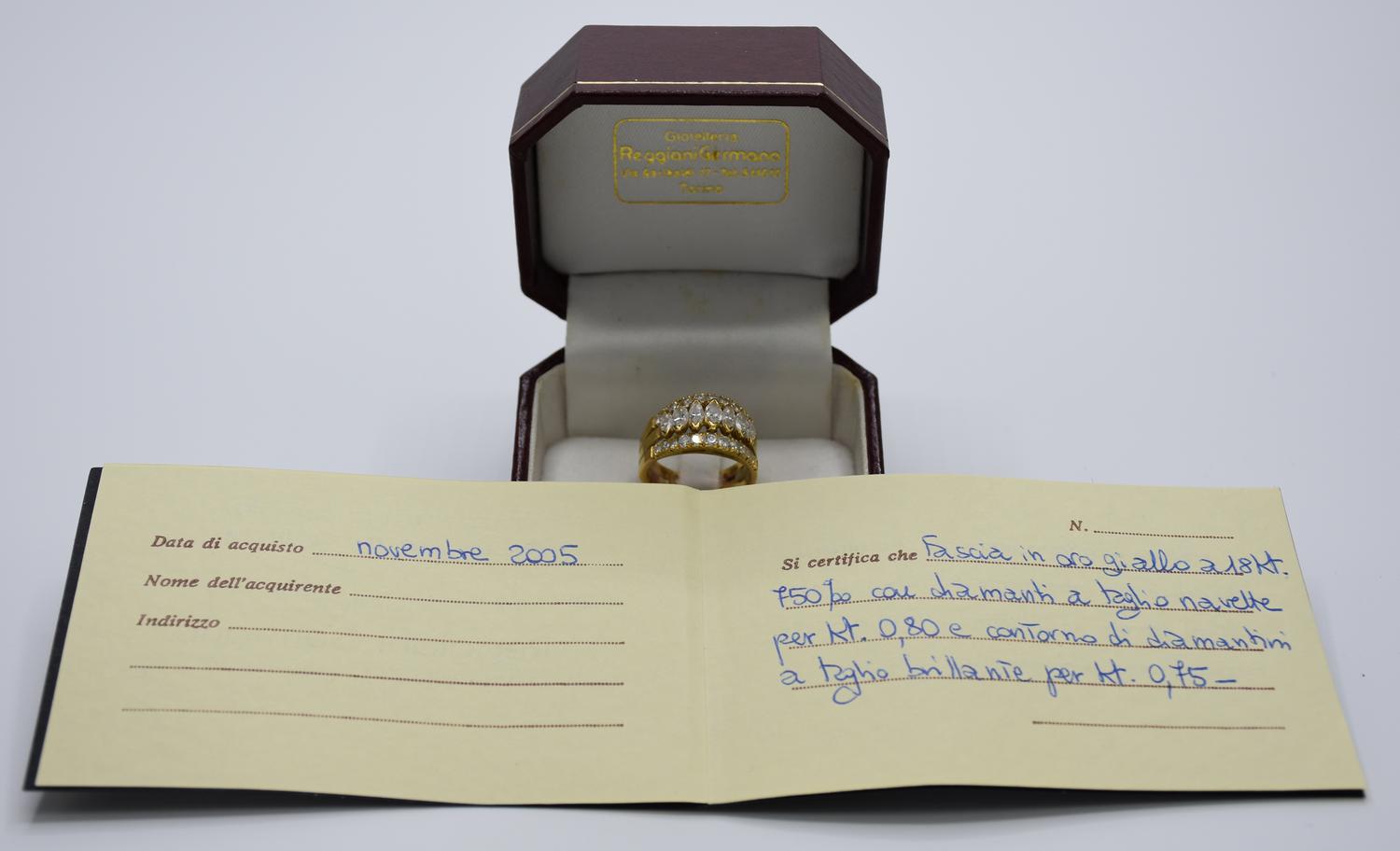elegante anello a triplice fascia in oro giallo, impreziosito da diamanti taglio navette per ct. 0,80 e diamantini taglio brillante per ct. 0,70