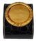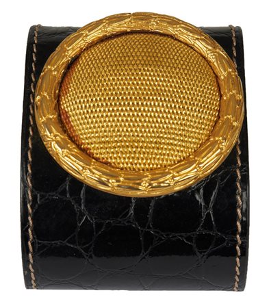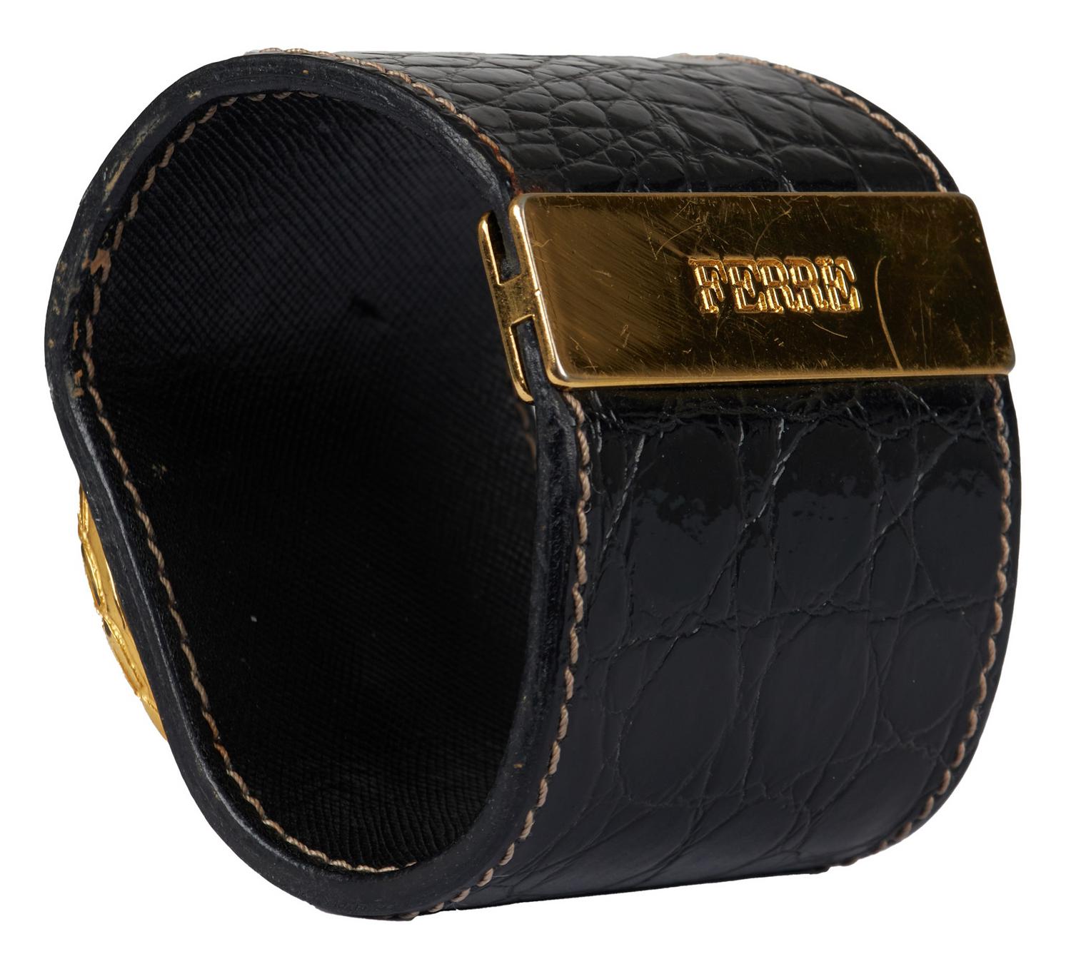 This Gianfranco Ferré cuff styled bracelet is crafted from textured black leather and featuring a golden metal dome for a stylish accent. Signature Ferré logo engraving adds a touch of designer flair. Remarks: There are some stains and scratches on the metal. Circumference:19.5 cm. Very good condition.