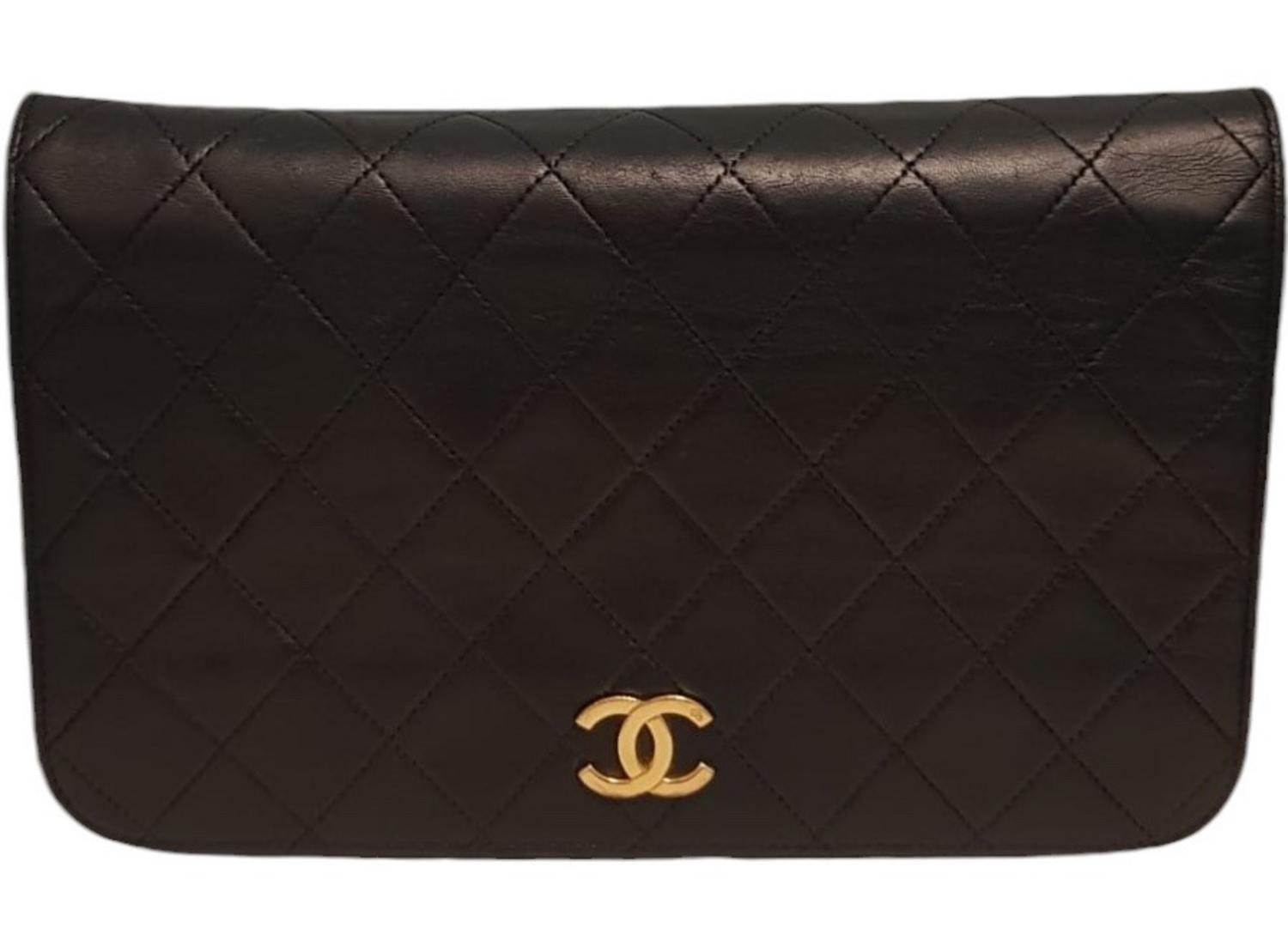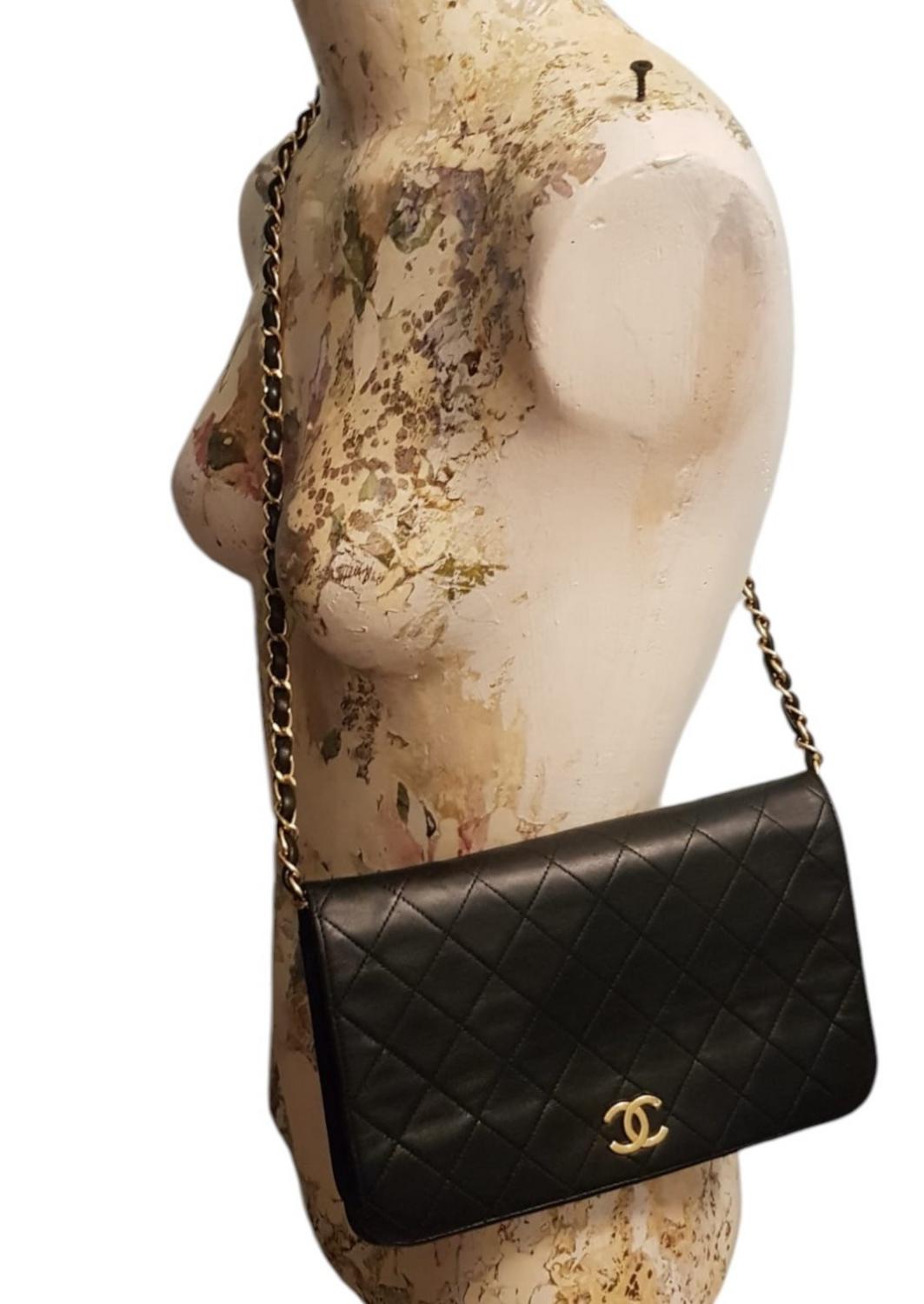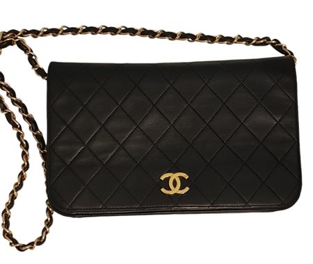 Borsa Chanel Classica in pelle di vitello nera matelassé, con tracolla a catena. A patta singola, chiusura con bottone automatico. Interno color bordeaux con un taschino laterale con cerniera. Hardware in metallo dorato. Presentata con dustbag originale. Cm 22x17x5. Prodotto in Francia. Piccole imperfezioni dovute all’uso, ma condizioni generali molto buone. Ben conservata.