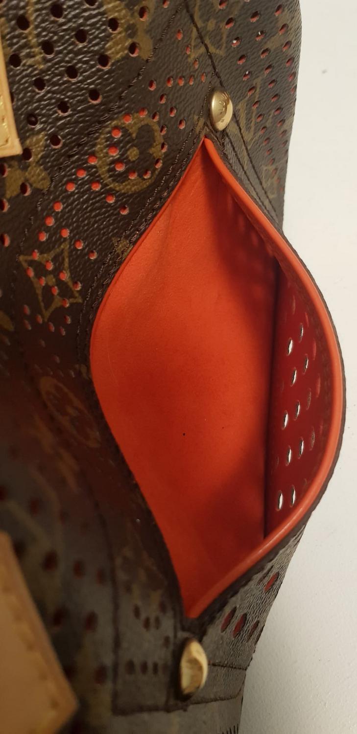 Speedy 30 edizione limitata Perforated in canvas monogram traforato e inserti in vacchetta. Interno in microfibra arancione. Hardware in metallo dorato. Cm 30x24x18. Codice riferimento prodotto: SP0016. Prodotto in Francia. Piccole imperfezioni dovute all’uso, ma ottime condizioni generali. Ben conservato.