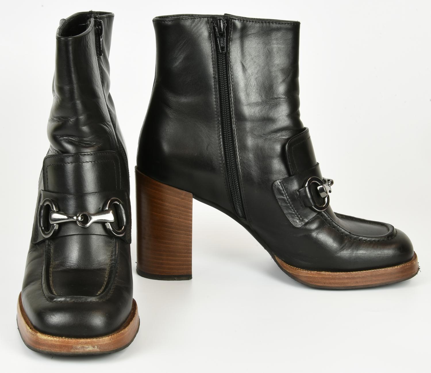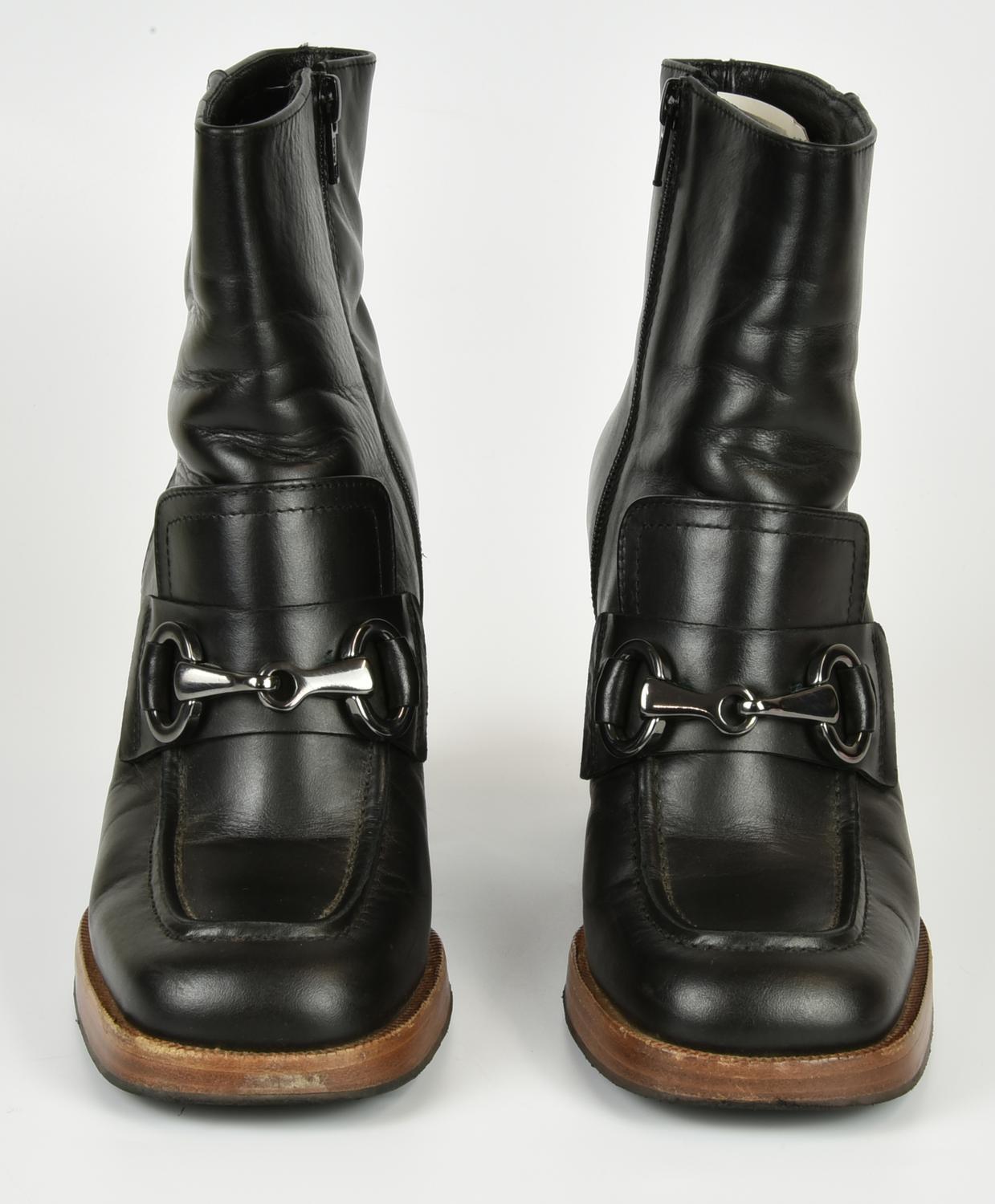 Leather ankle boots with decorative horsebit buckle. Wide heel: 9 cm. Size 38 IT. Presented with the original box. Made in Italy. Slight signs of use do not affect the excellent overall condition. Well preserved.