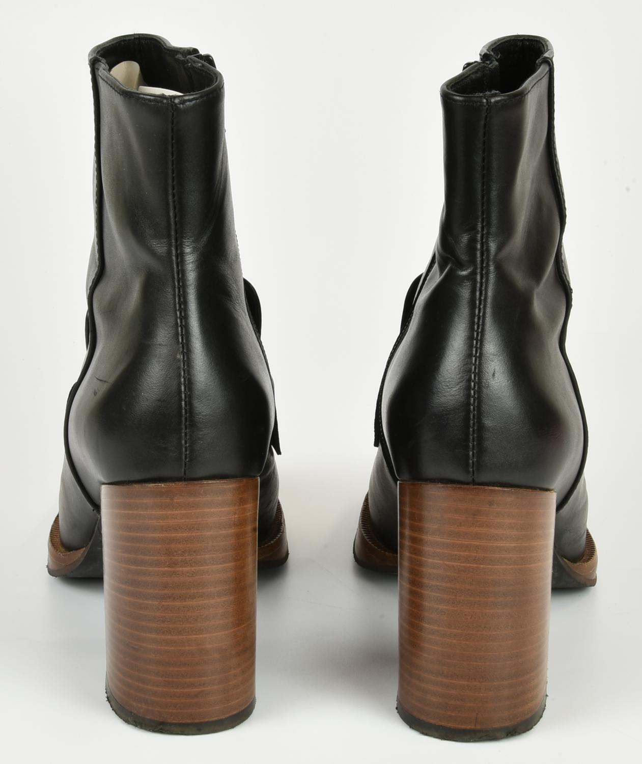 Stivaletti in pelle con fibbia a morsetto decorativa. Tacco largo di 9 cm. Taglia 38 IT. Presentati con scatola originale. Prodotti in Italia. Lievi segni d’uso non compromettono le ottime collezioni generali. Ben conservati.