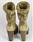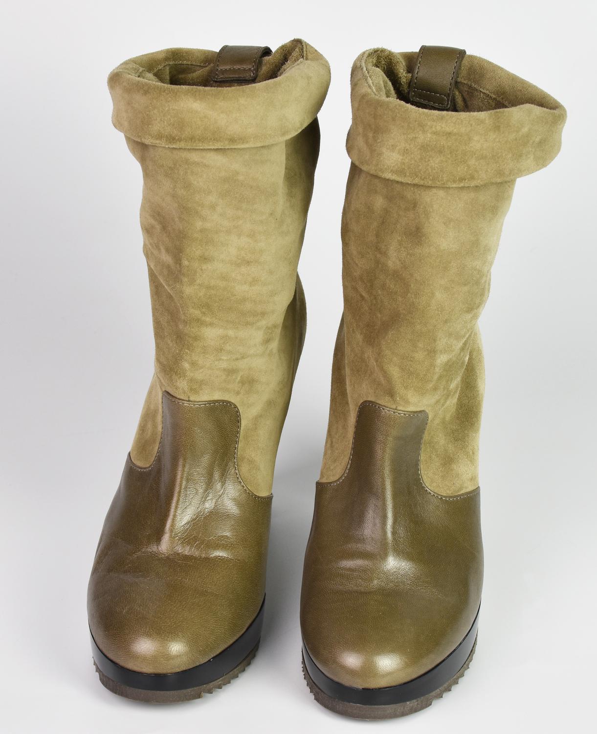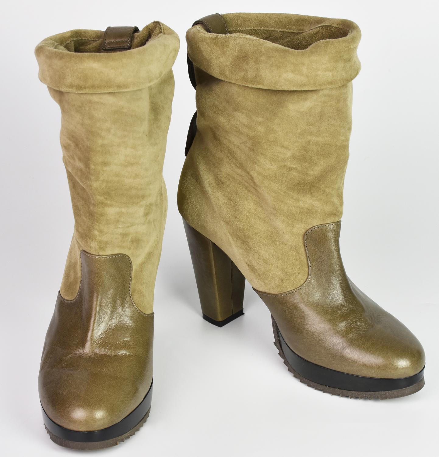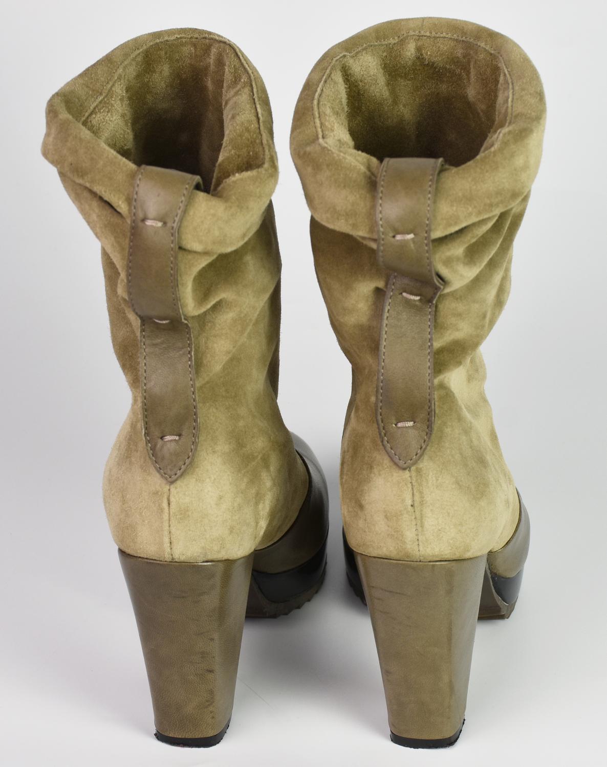 Tronchetti in suede con dettaglio in pelle sul tacco e in punta. Interno foderato in pelle e platform in materiale plastico trasparente. Tacco di 9,5 cm. Taglia 5,5. Prodotti in Francia. Perfettamente conservati.