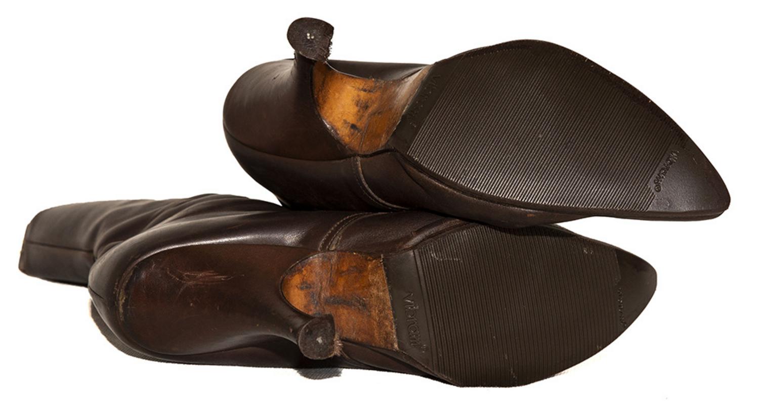 stivaletto con lacci in pelle colore marrone testa di moro. Modello raro mid 80. Made in England, size 39. Tacco 11. Altezza stivale cm 31. Dato che il prodotto non riporta più il marchio, viene fornito su richiesta una lettera di autenticità del prodotto da parte di Vivienne Westwood Brand.