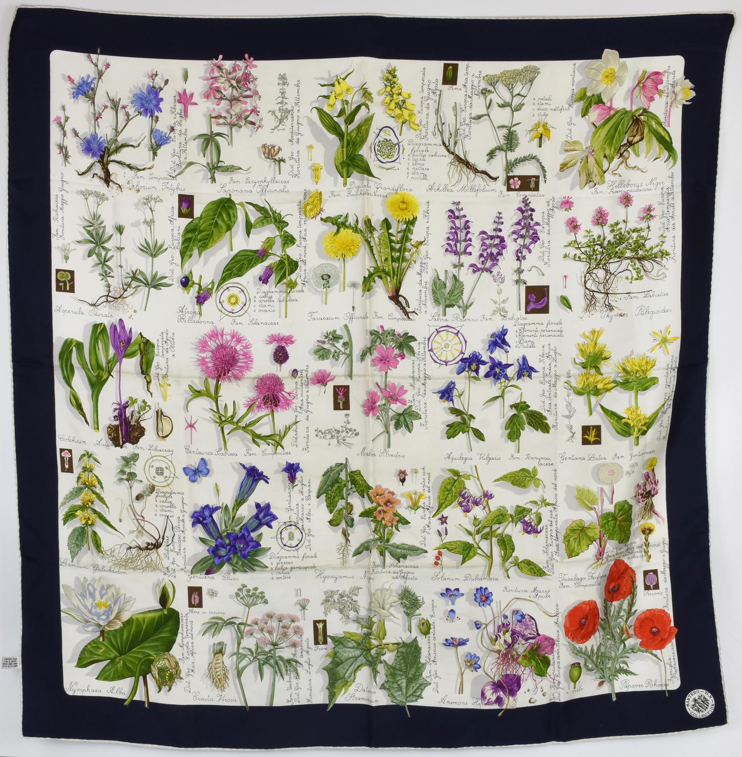Silk scarf with a botanical print. Dimensions: 86.00 x 86.50 cm. 100% silk. Made in Italy. Well preserved.