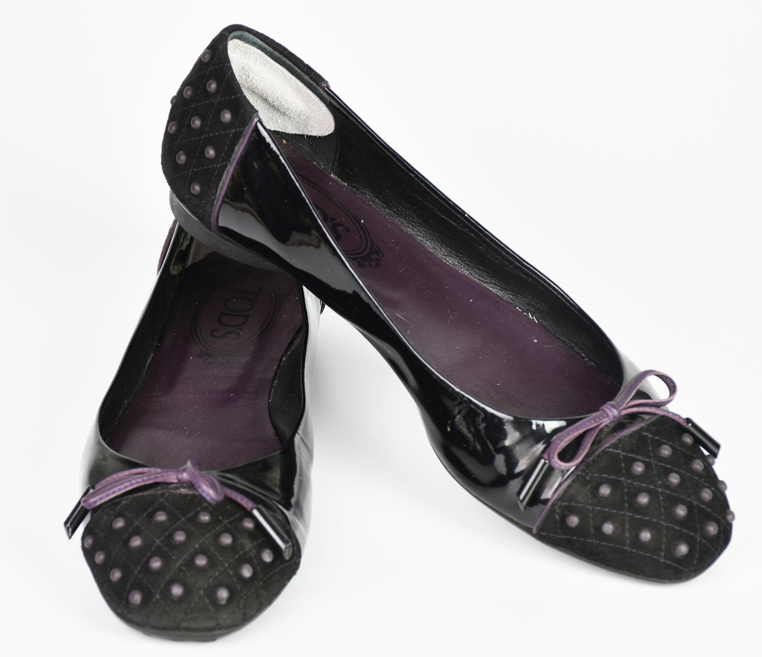 Ballerine in vernice nera con dettagli in camoscio. Taglia 37 IT. Prodotte in Italia. Segni d’uso e difetti. Discretamente conservate.