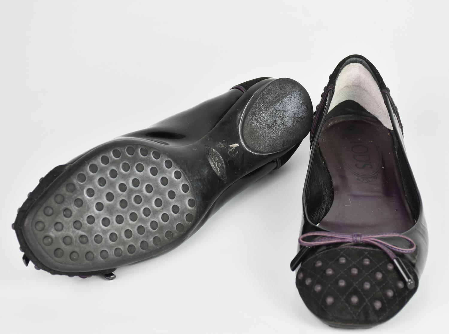 Black patent leather ballerina flats with suede details. Size 37 IT. Made in Italy. Signs of wear and defects. Fairly well preserved.