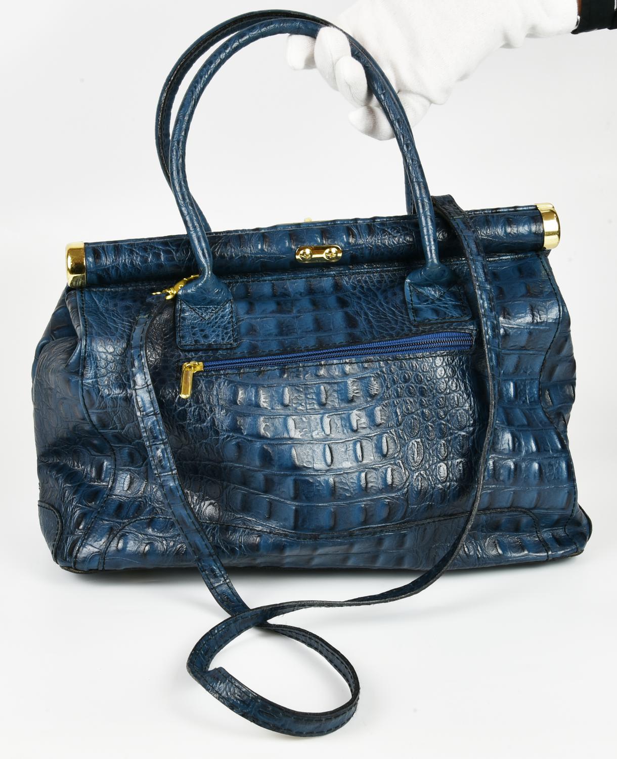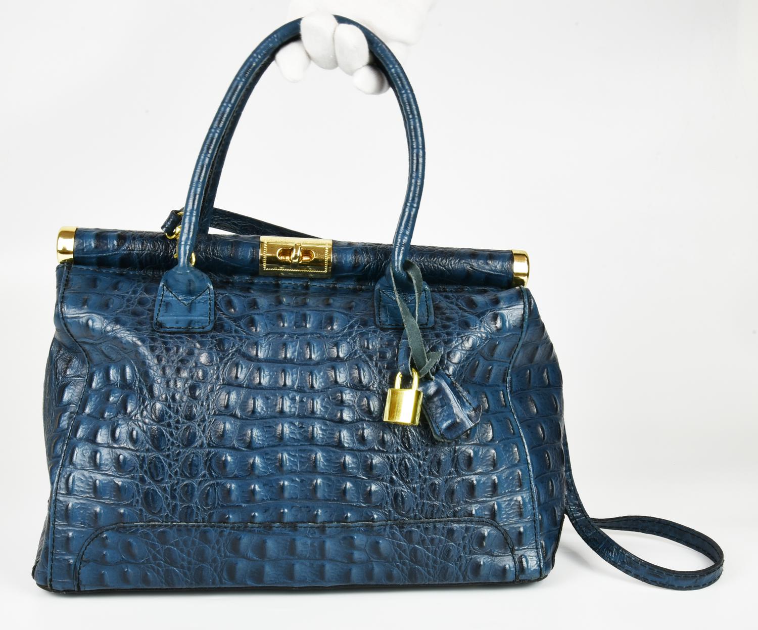 Doctor Bag style bag in blue crocodile-printed leather. Features double handles, a central snap closure, and a removable shoulder strap. The fabric-lined interior is organized into three compartments, one with a zipper closure, and two side pockets, one applied and one with a zipper. The exterior includes a back pocket with a zipper. Comes with a clochette, lock, and keys. Gold-tone metal hardware. Dimensions: 33.00 x 25.50 x 15.00 cm. Height including handles: 38.00 cm. Made in Italy. Excellent overall condition. Well preserved.
