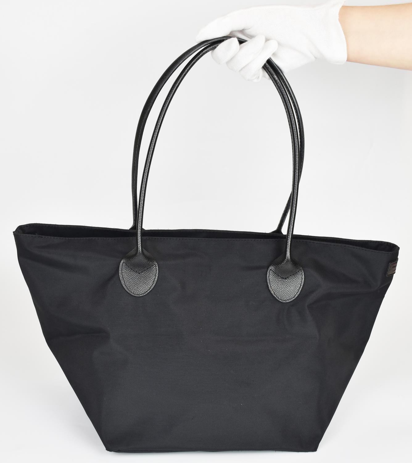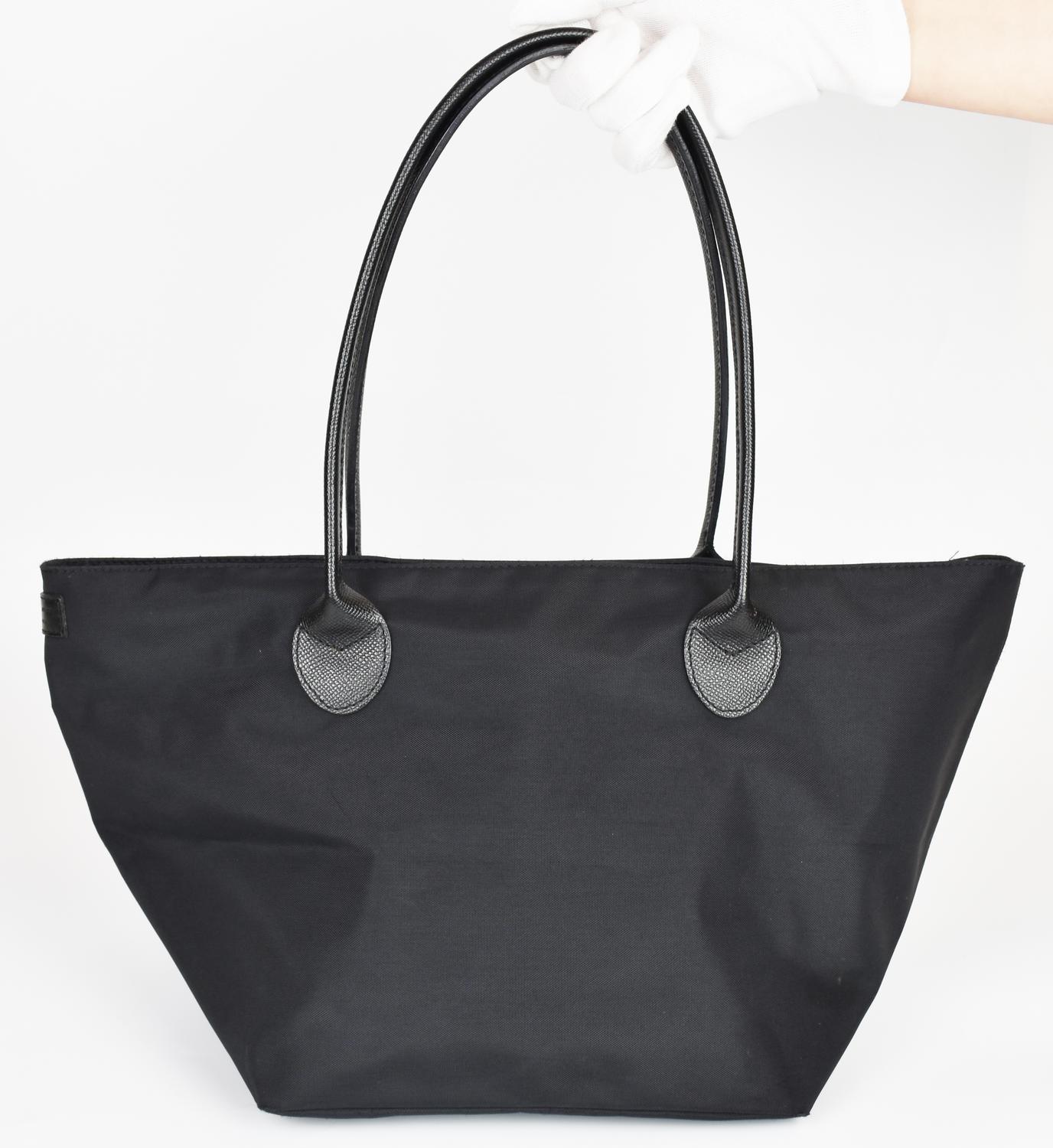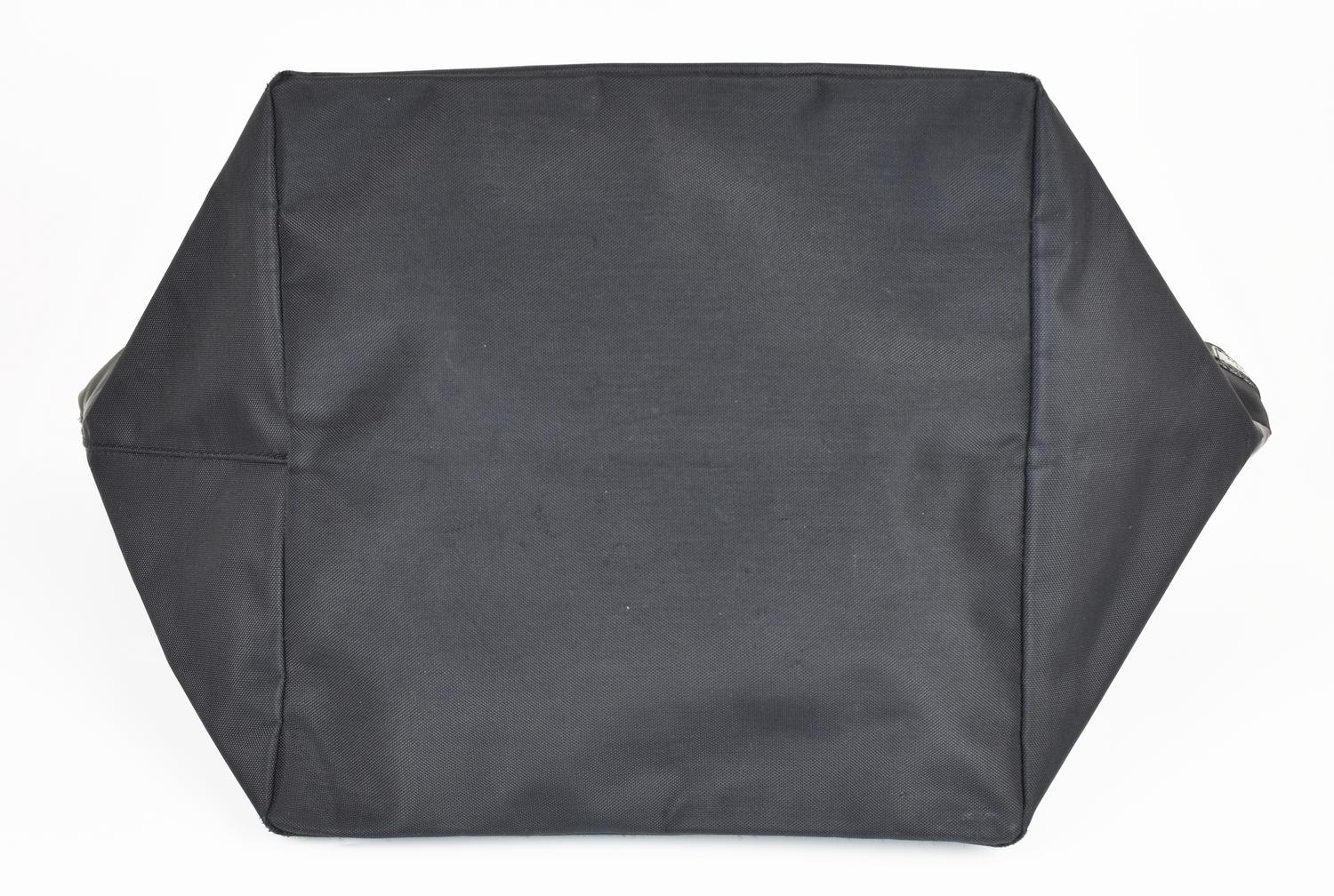 Borsa modello shopper in tessuto tecnico e inserti in pelle. Doppi manici e chiusura centrale con cerniera. Interno organizzato in unico vano con taschino laterale applicato. Prodotto in Francia. Ben conservato.