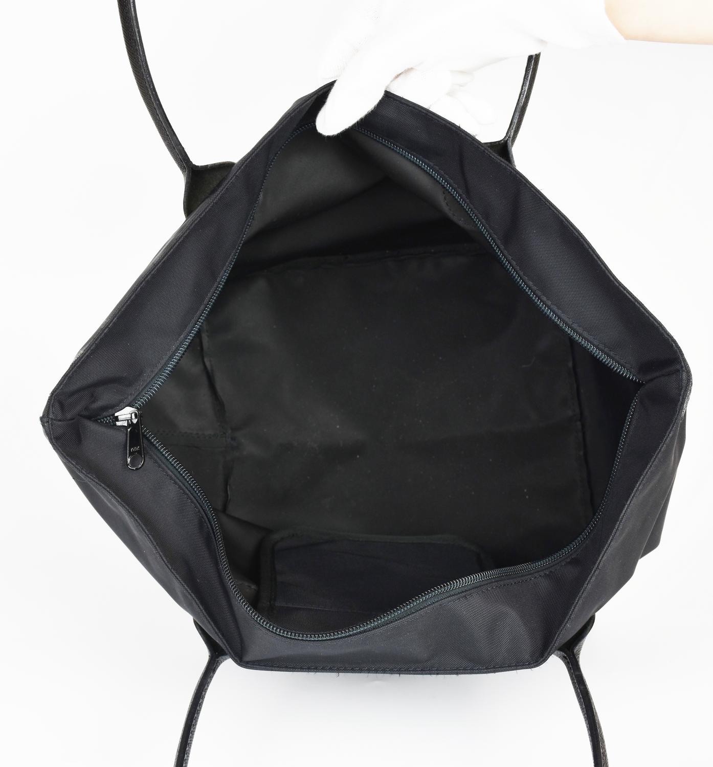 Shopper bag in technical fabric with leather inserts. Features double handles and a central zip closure. The interior is organized into a single compartment with an attached side pocket. Made in France. Well preserved.