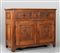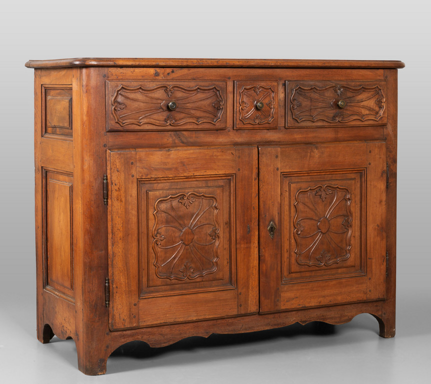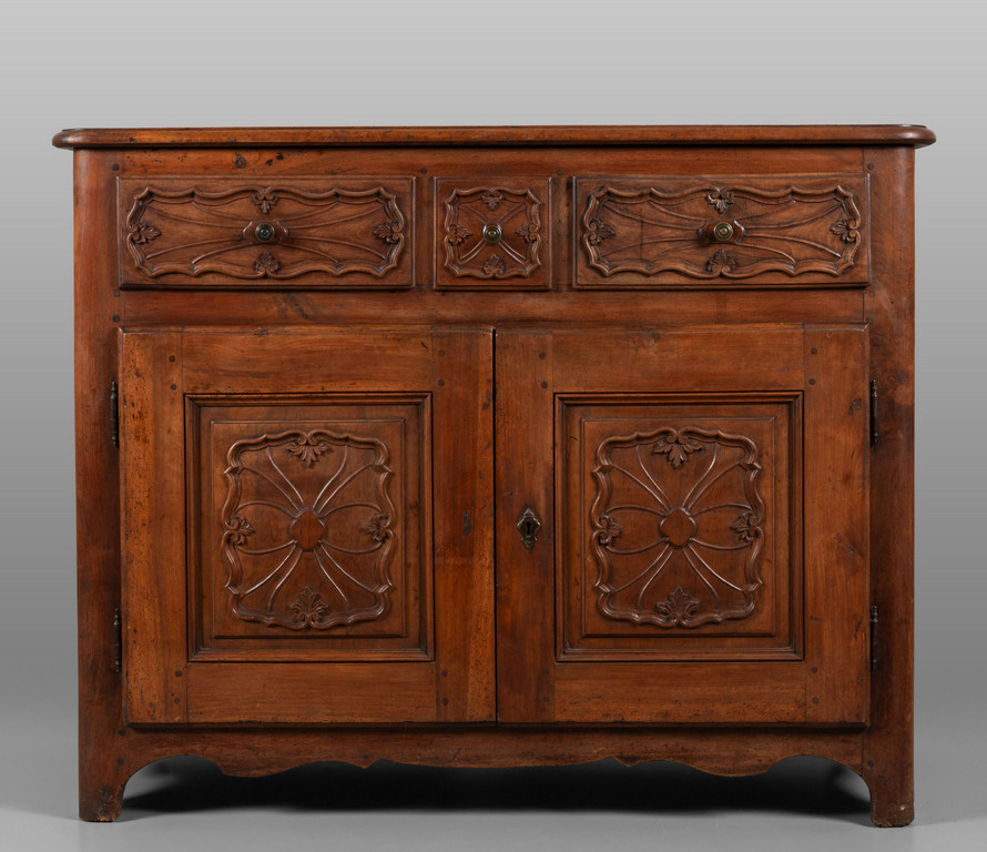 Credenza Luigi XIV in noce a due sportelli e tre cassetti scolpita a formelle barocche Piemonte sec.XVIII