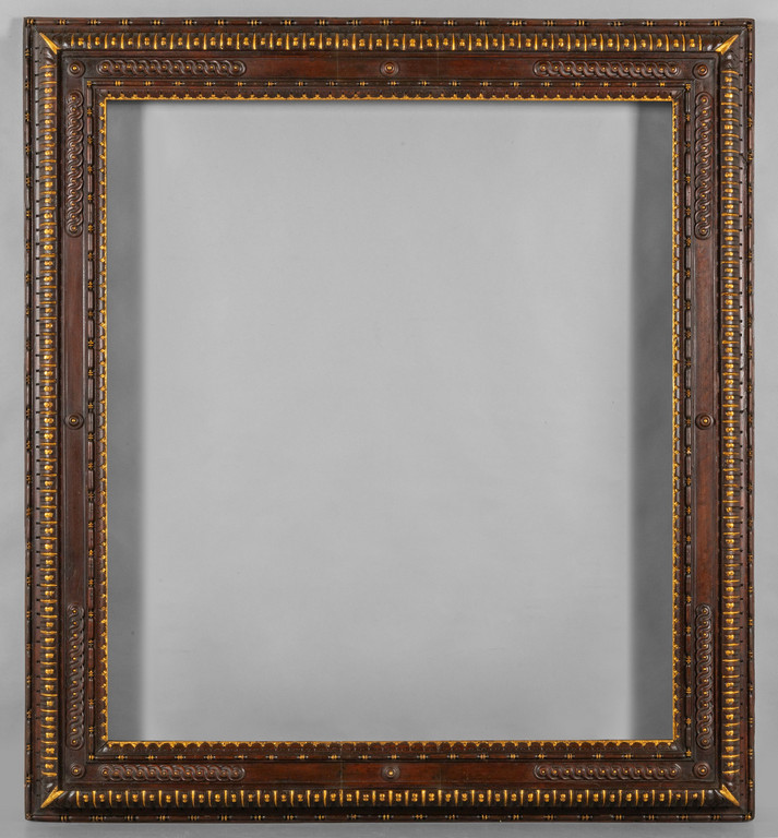 Antica cornice in legno ebanizzato intagliato e lumeggiata in oro