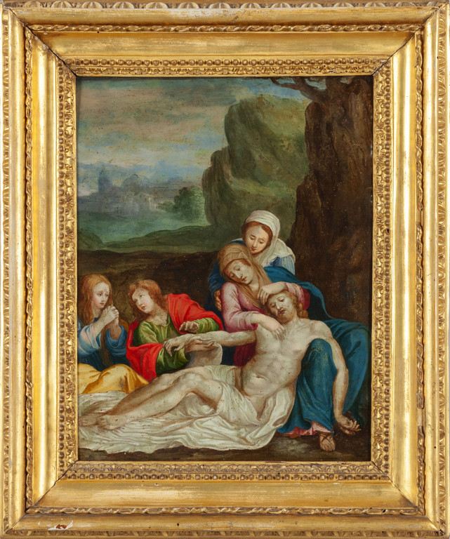 Scuola fiamminga sec.XVIII 'Deposizione' olio su rame cornice coeva in legno intagliato e dorato