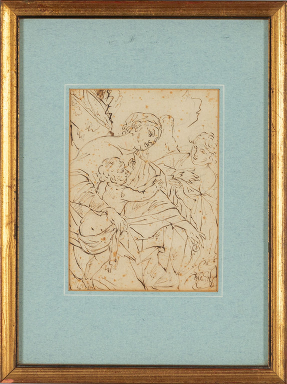 Scuola napoletana sec.XVIII 'Madonna con Bambino ed Angelo' disegno a penna su carta