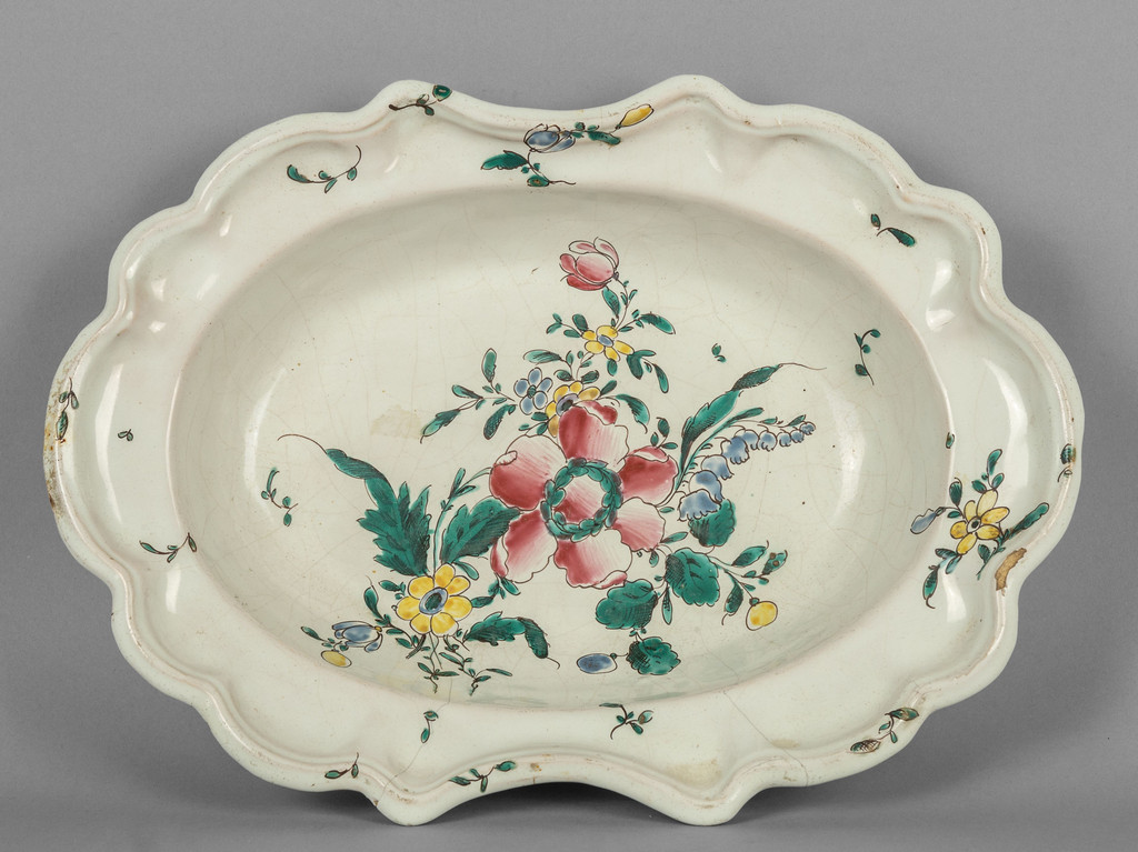 Bacile da barba in maiolica con fiori in policromia manifattura Boselli Savona sec.XVIII
