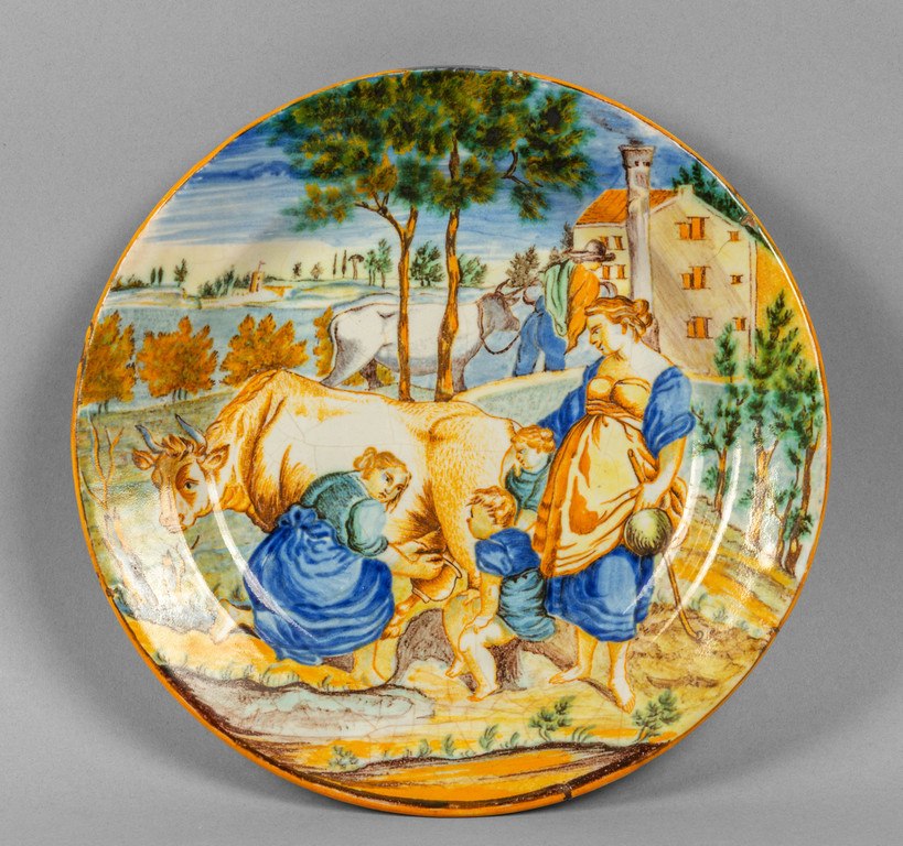 Piatto in maiolica policroma con scena di vita contadina Italia Centrale sec.XIX