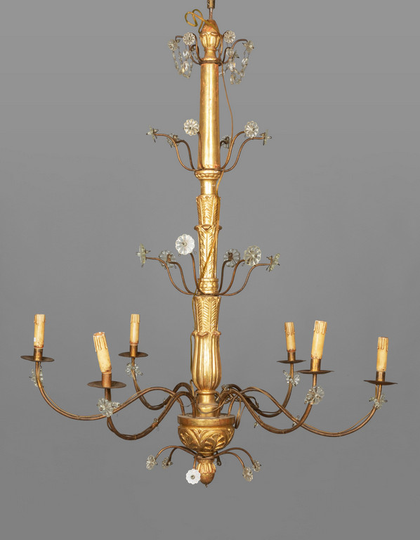 Lampadario Luigi XVI con fusto in legno intagliato e dorato a sei luci Genova inizi sec.XIX