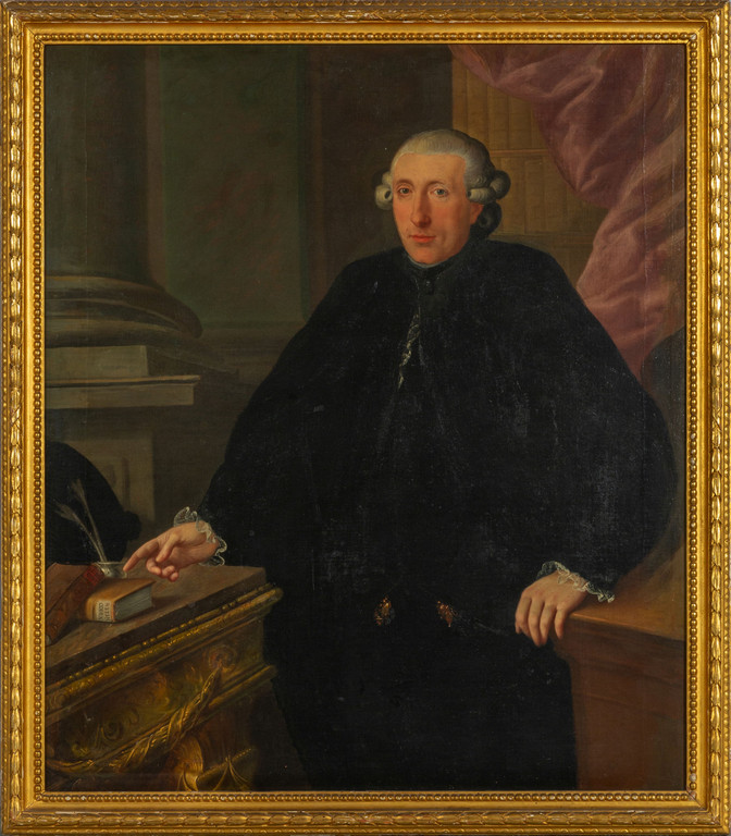 Scuola veneta sec.XVIII 'Ritratto di giurista con libro' olio bella cornice antica in legno intagliato e dorato