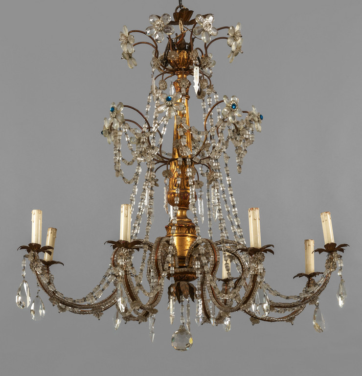 Lampadario a otto luci fusto centrale in legno dorato ricca decorazione in cristalli Genova sec.XIX