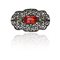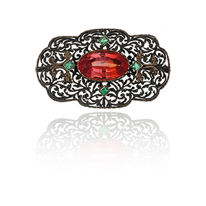 Spilla in argento e oro con lavorazione traforata e quattro piccoli smeraldi carrè e corindone sintetico.