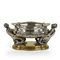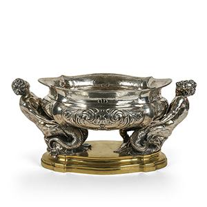 Elegante centrotavola in argento la base in ottone dorato è sormontata da due possenti sculture a guisa di sirene che sorreggono un bacile finemente inciso e lavorato.