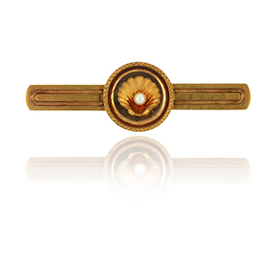 Spilla a barretta in oro giallo al centro una conchiglia con perla realizzata alla maniera di 'Castellani' con fine incisione e doratura a zecchino.