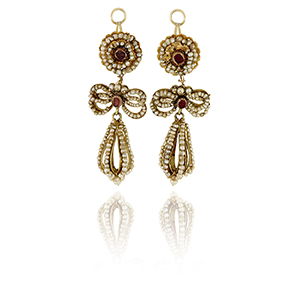 Orecchini pendenti antichi di primi '800 in oro con microperle naturali e rubini.