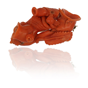 Spilla in corallo rosso di antica manifattura un ramo di corallo intagliato a forma di intreccio fiorito è sostenuto da una montatura in oro giallo al retro.