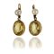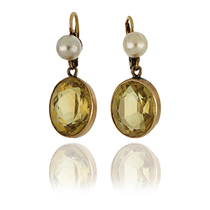 Orecchini pendenti in oro rosso con due quarzi citrini e perle coltivate. Chiusura a monachella.