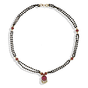 Collana di manifattura indiana in oro basso con rubini sintetici sfere in pietre dure nere e perline.