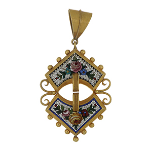Ciondolo in oro giallo dorato a 24K al centro contrapposti due fini mosaici a tema floreale lavorazione alla maniera di Castellani con perline in oro e filigrana nella contromaglia.